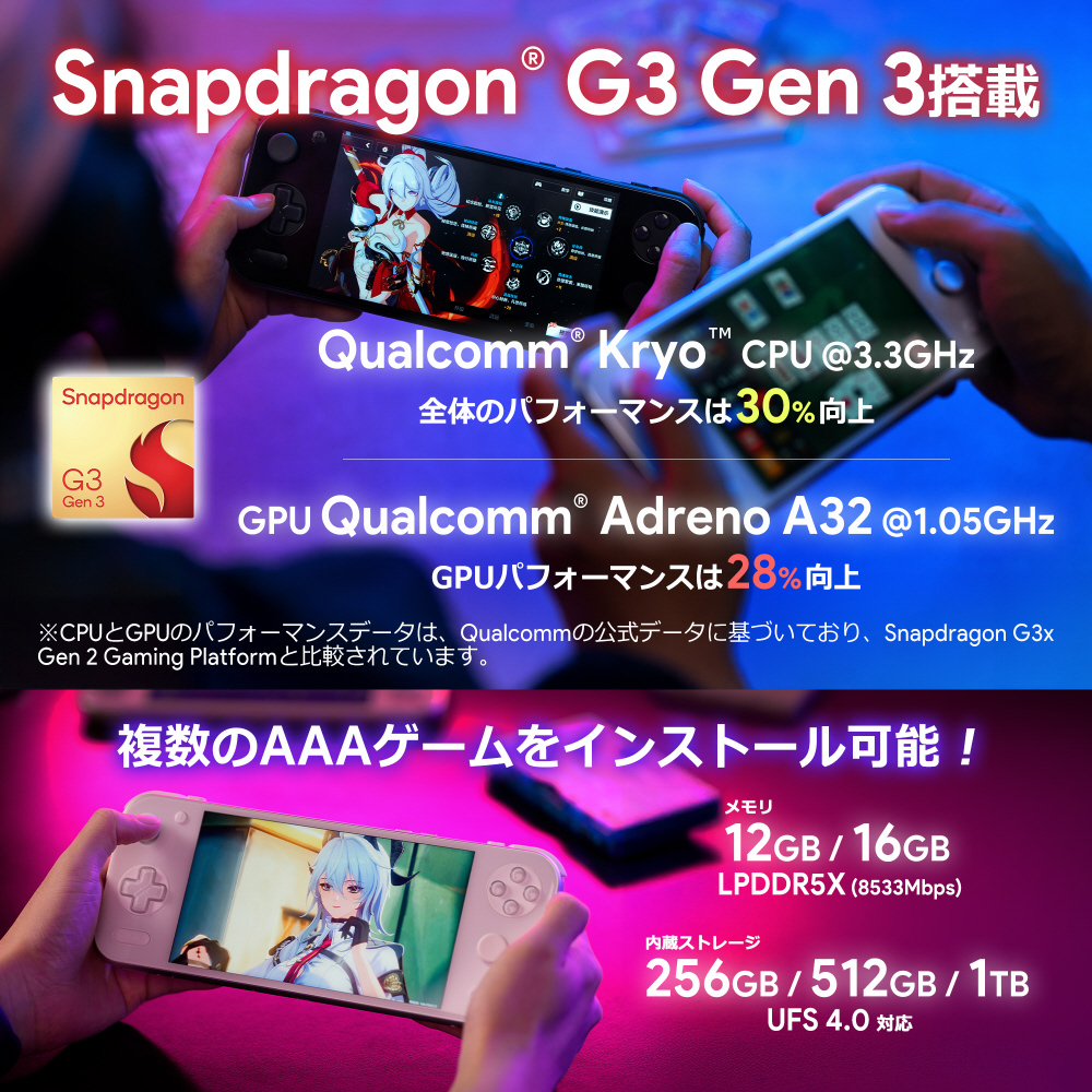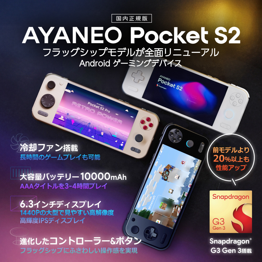 ゲームプラットフォームに特化したSoC“Snapdragon G3 Gen 3”搭載「AYANEO Pocket S2」。高出力・低消費電・包括的なアップグレードを実現しました。すべてに丸みをもたせた持ちやすいグリップ、アップグレードされたコントロール性能と没入感のあるグラフィックを体感できます。