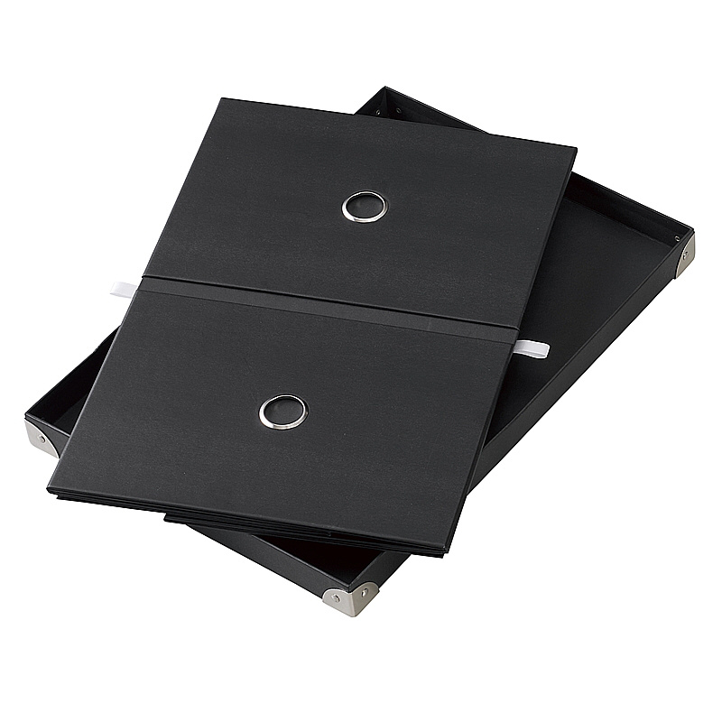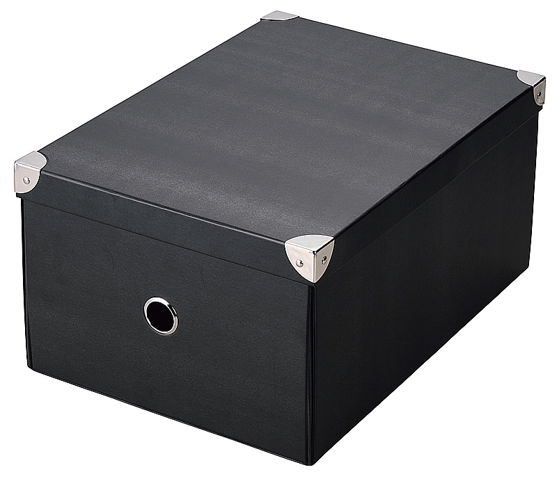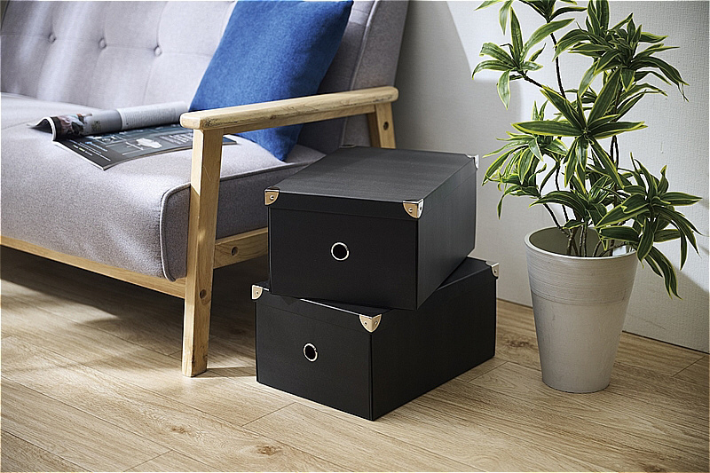 組立が簡単でどんなシーンでも使える、フタ付のおしゃれなパルプ素材の収納ボックスです。引き出しやすく持ち運びもしやすい丸型取っ手付。角には補強金具が付いており、強度UP!つぶれにくい仕様になっています。使わない時は、小さく折りたためます。CDや文庫本、小物の整理にぴったりサイズです。写真や文具の整理にもおすすめです。デスクの上に置いても◎。COOLなブラックカラー。