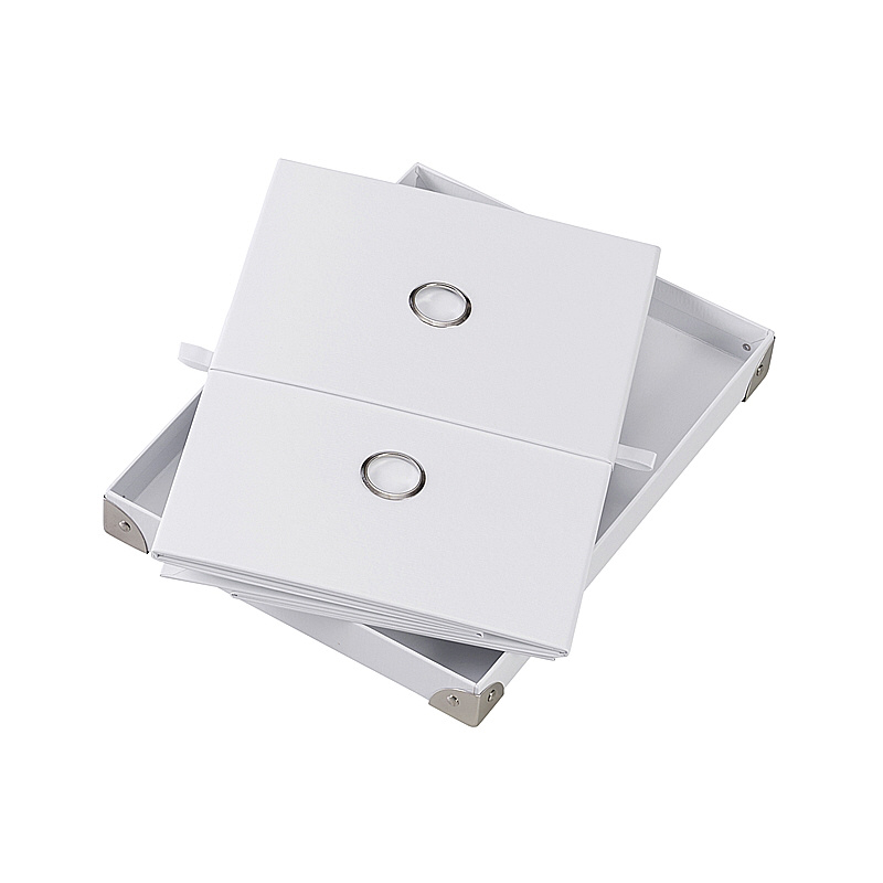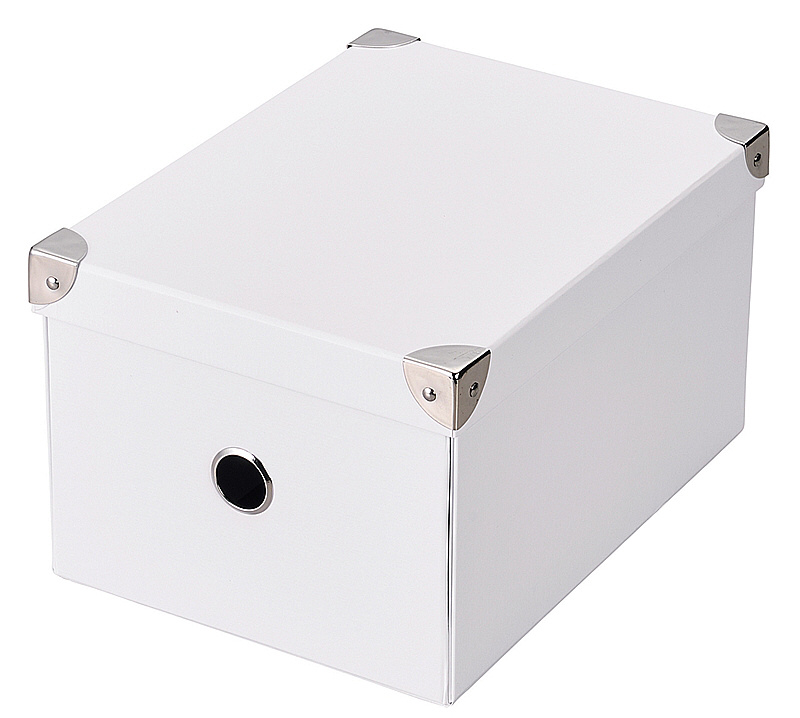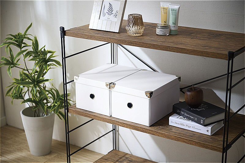 組立が簡単でどんなシーンでも使える、フタ付のおしゃれなパルプ素材の収納ボックスです。引き出しやすく持ち運びもしやすい丸型取っ手付。角には補強金具が付いており、強度UP!つぶれにくい仕様になっています。使わない時は、小さく折りたためます。CDや文庫本、小物の整理にぴったりサイズです。写真や文具の整理にもおすすめです。デスクの上に置いても◎。清潔感のあるホワイトカラー。