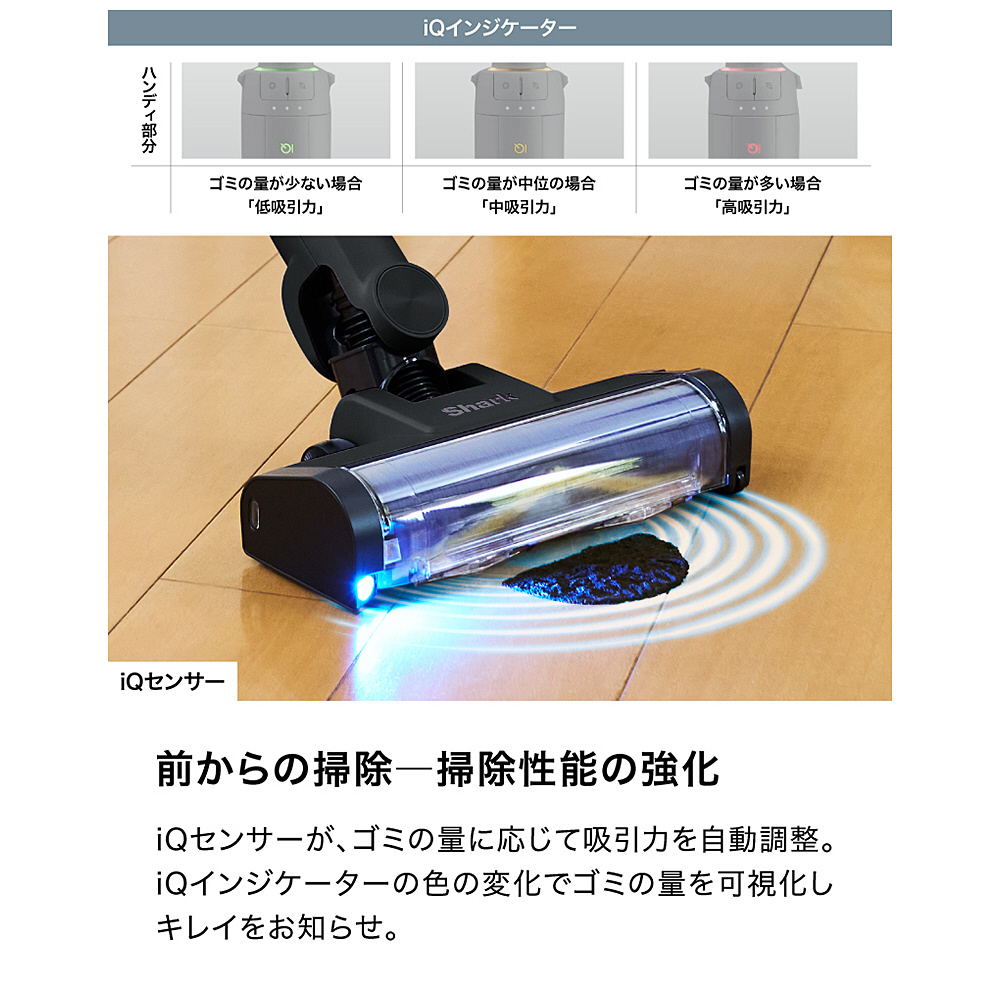 ■iQセンサーがゴミの量に合わせて吸引力を自動調整することで、効率的にお掃除できる