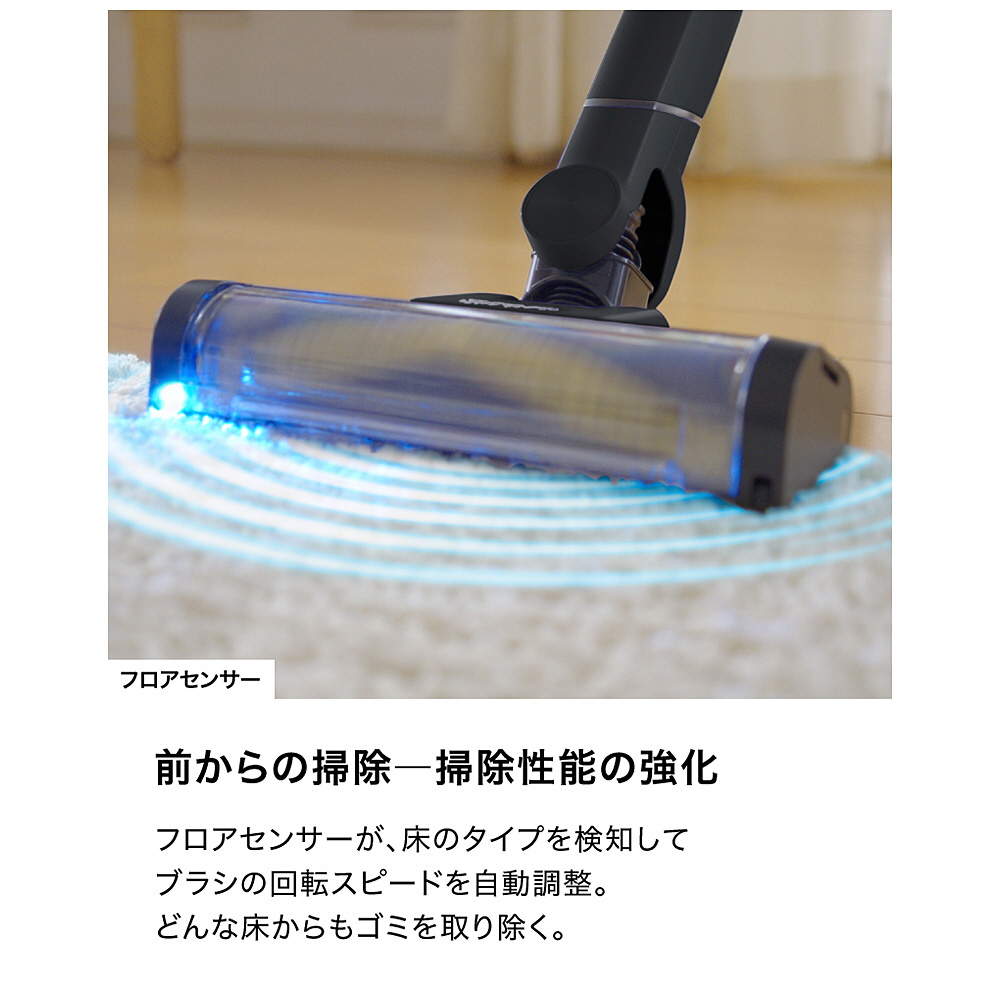 ■フロアセンサーがフローリングやカーペットなど床材に合わせてブラシの回転速度を自動調整。カーペットではブラシの回転スピードを高めることでゴミをかき出しながら取り除く
