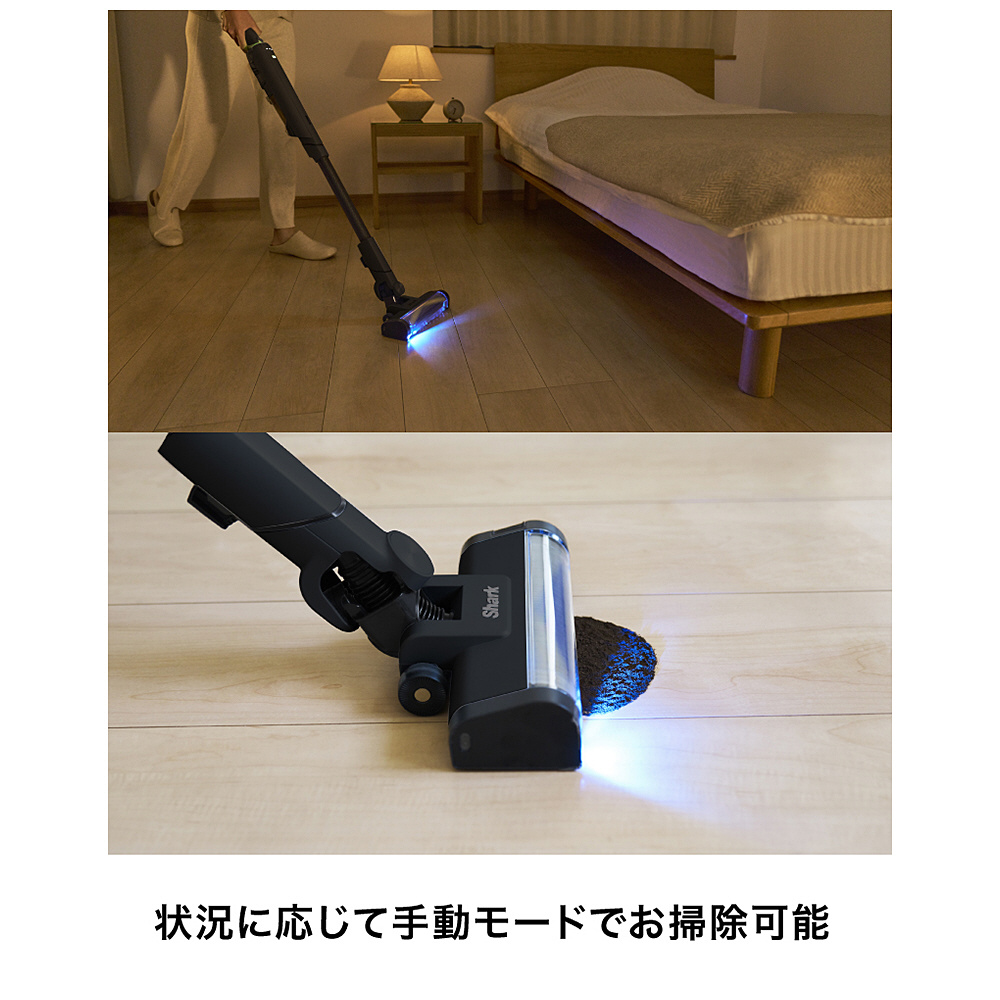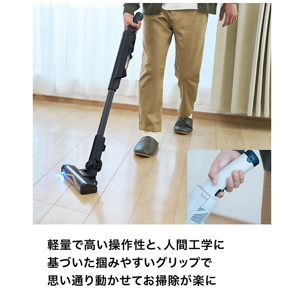 ■青色LEDヘッドライトが床のゴミやホコリを浮かび上がらせ、可視化することで取り残しを防ぐ