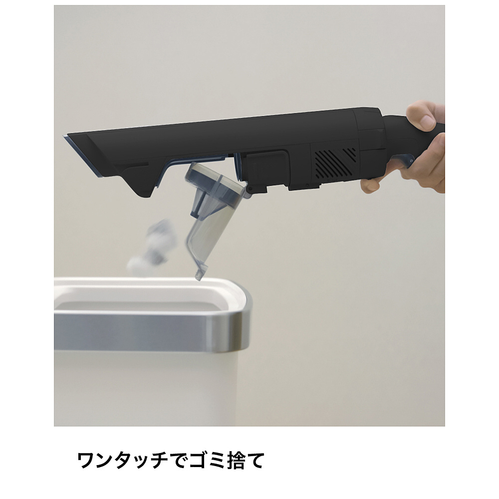 ■片手でリリースボタンをつまむだけで強力なハンディに。家具上や狭い場所のお掃除も、気づいた時にサッと取ってサッと使える。ボタンを押すだけでゴミ捨てが簡単。ゴミも飛び散りづらく、手を汚すことなく衛生的