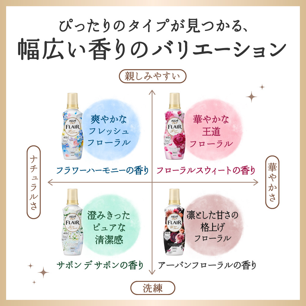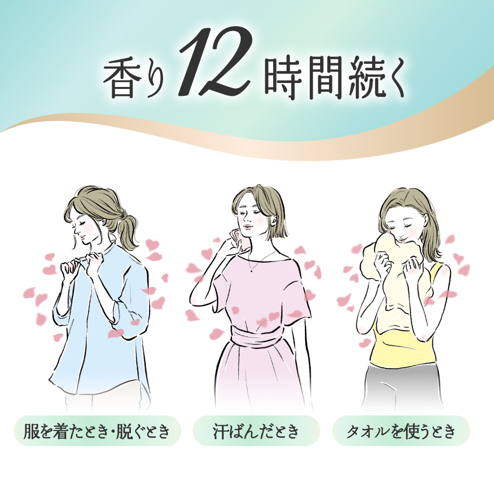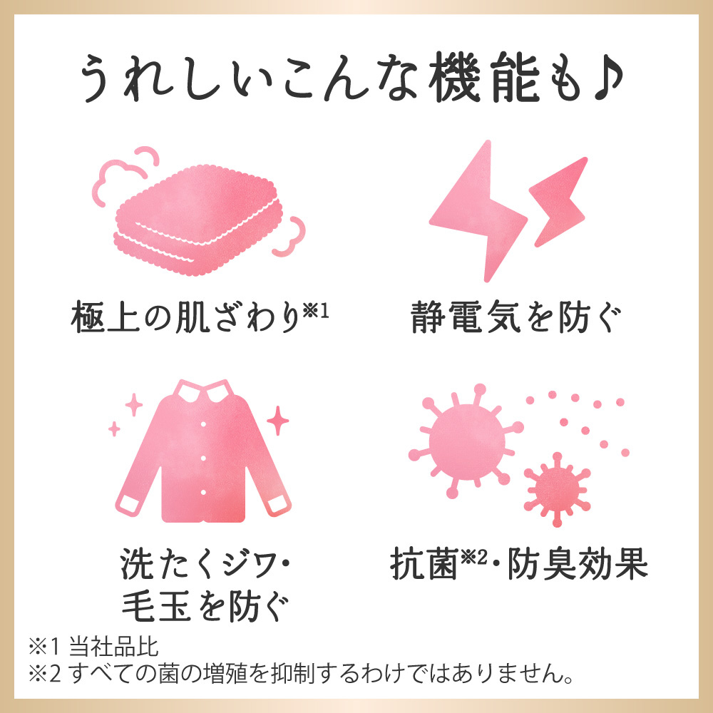 着用中発香力2倍*1。最高級*2アロマバランスで美しい香り続くダイヤモンドアロマ製法。サボン デ サボンの香り。香り12時間続く。極上の肌ざわり*3。シワ、毛玉、静電気を防ぐ。抗菌*4防臭効果。*1従来品比 素材によって効果が異なる場合があります。*2当社柔軟剤内。*3当社品比。*4すべての菌をの殖を抑制するわけではありません。