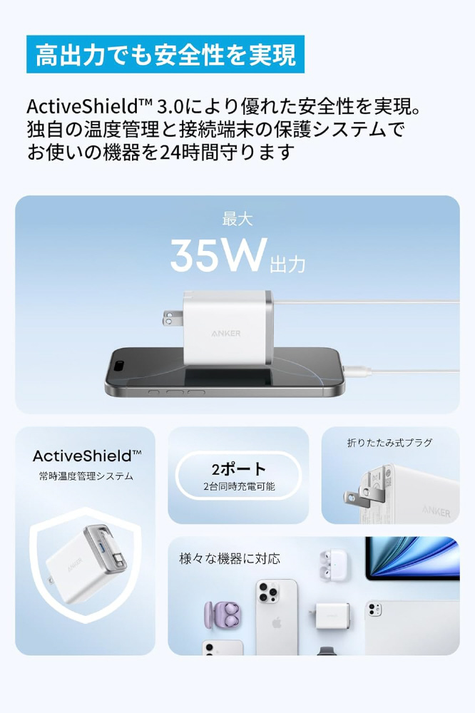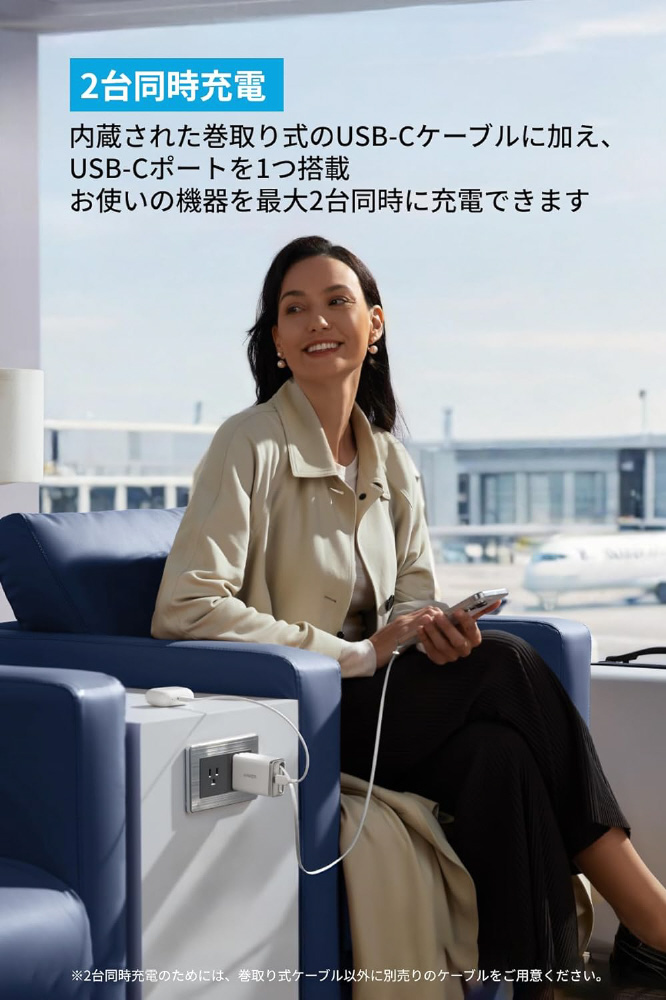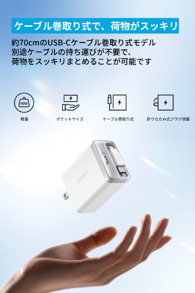 充電器 Anker Nano Charger (35W, 巻取り式 USB-Cケーブル) ホワイト A2658N21 [USB Power Delivery対応 /2ポート] 【sof001】