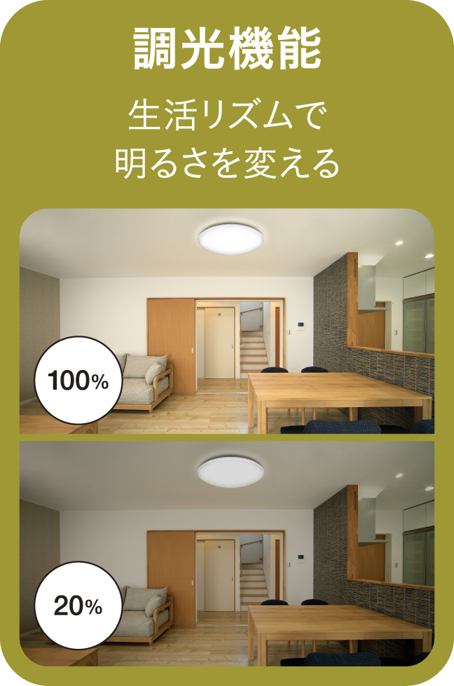例 8畳の場合:4299lm⇒3300lm 28.9W⇒23.1W 20%の省エネ
