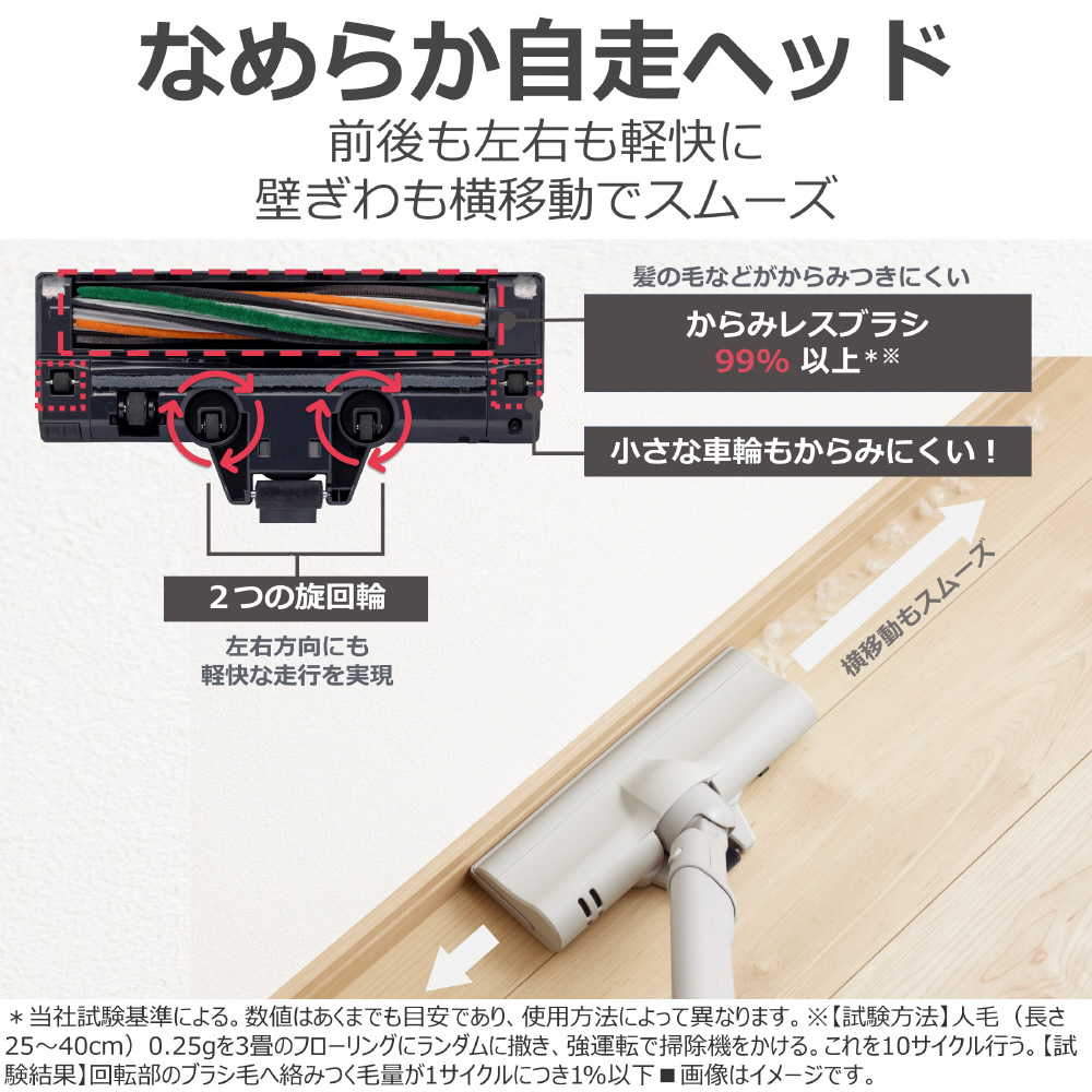 ・「なめらか自走ヘッド」で滑るようにキレイ。壁際も横滑りで一気にゴミが取れます。