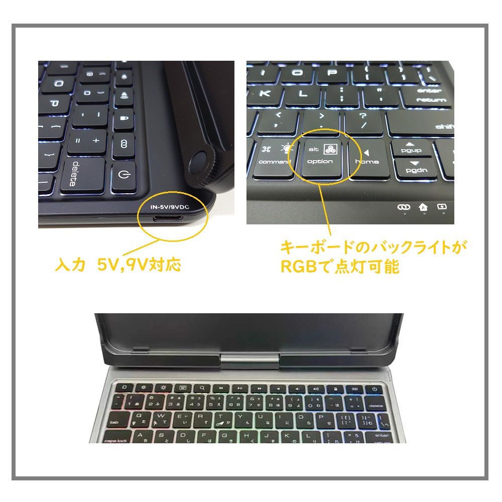 美しいフォルムのクラムシェル型ケースです。キーボードはRGBでバックライト点灯機能もあります。