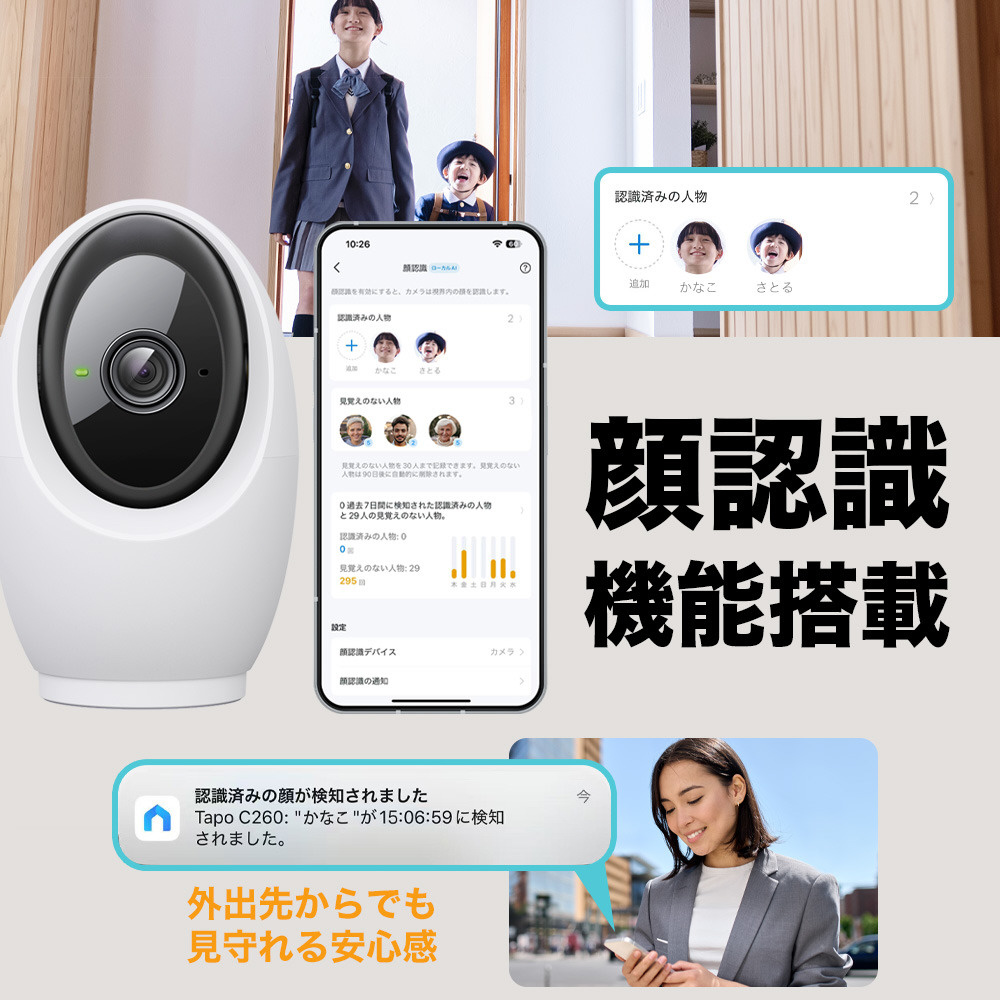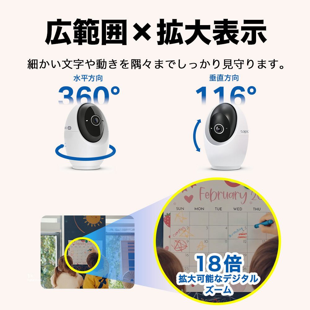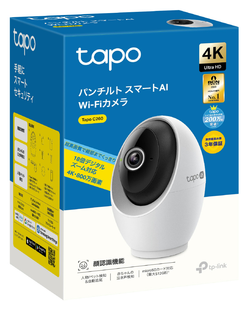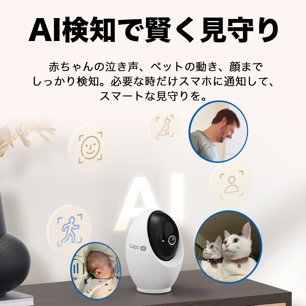 4K超高画質×顔まで見分けるAI搭載で留守中も安心。パンチルトスマートAI Wi-FiカメラTapo C260