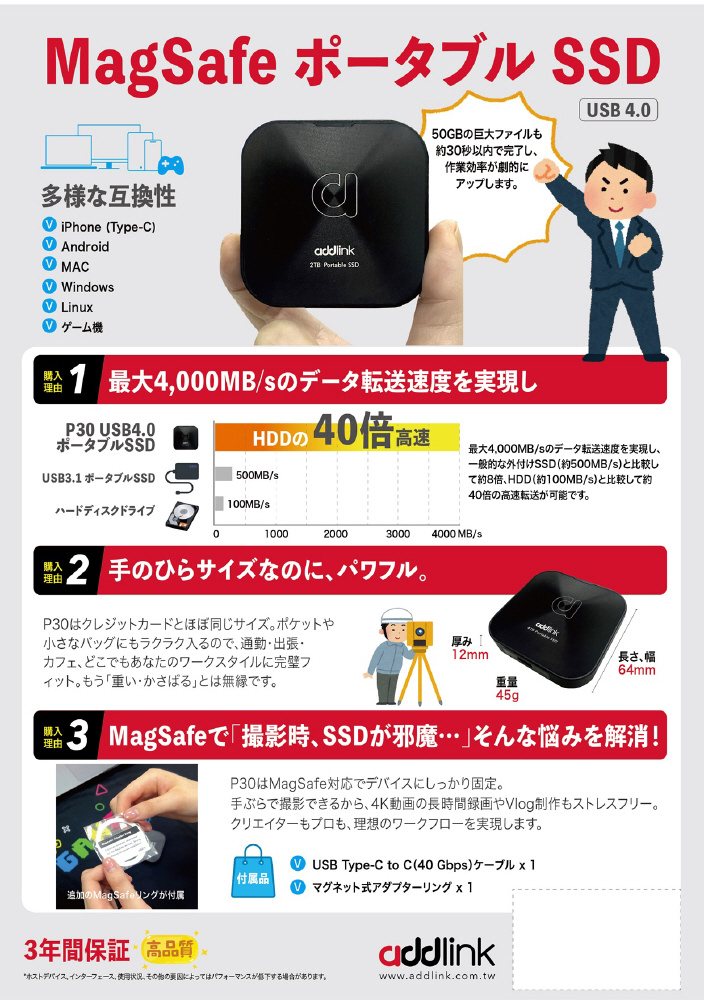 P30 Magsafeポータブルは USB4.0 Type-C 接続で最大 4000MB/s の超高速転送速度を実現しUSB Type-C を備えたデバイス間でゲーム、写真、ビデオをわずか数秒でデーター転送できるポータブルSSDです。
