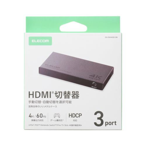 HDMI(R)ポート不足を解消して、3台のHDMI機器をボタン一つで切り替えできるHDMI切替器です。4K60Hz、HDR、HDCP2.2対応でゲーミングやホームシアター環境構築におすすめです。手動切り替えで思わぬ誤作動を防止し、自動切り替え機能も搭載(ON/OFF可能)しています。メタル筐体で放熱性も高いです。PS5(TM)、NINTENDO SWITCH(TM)、Fire TV Stick 4Kに対応しています。
