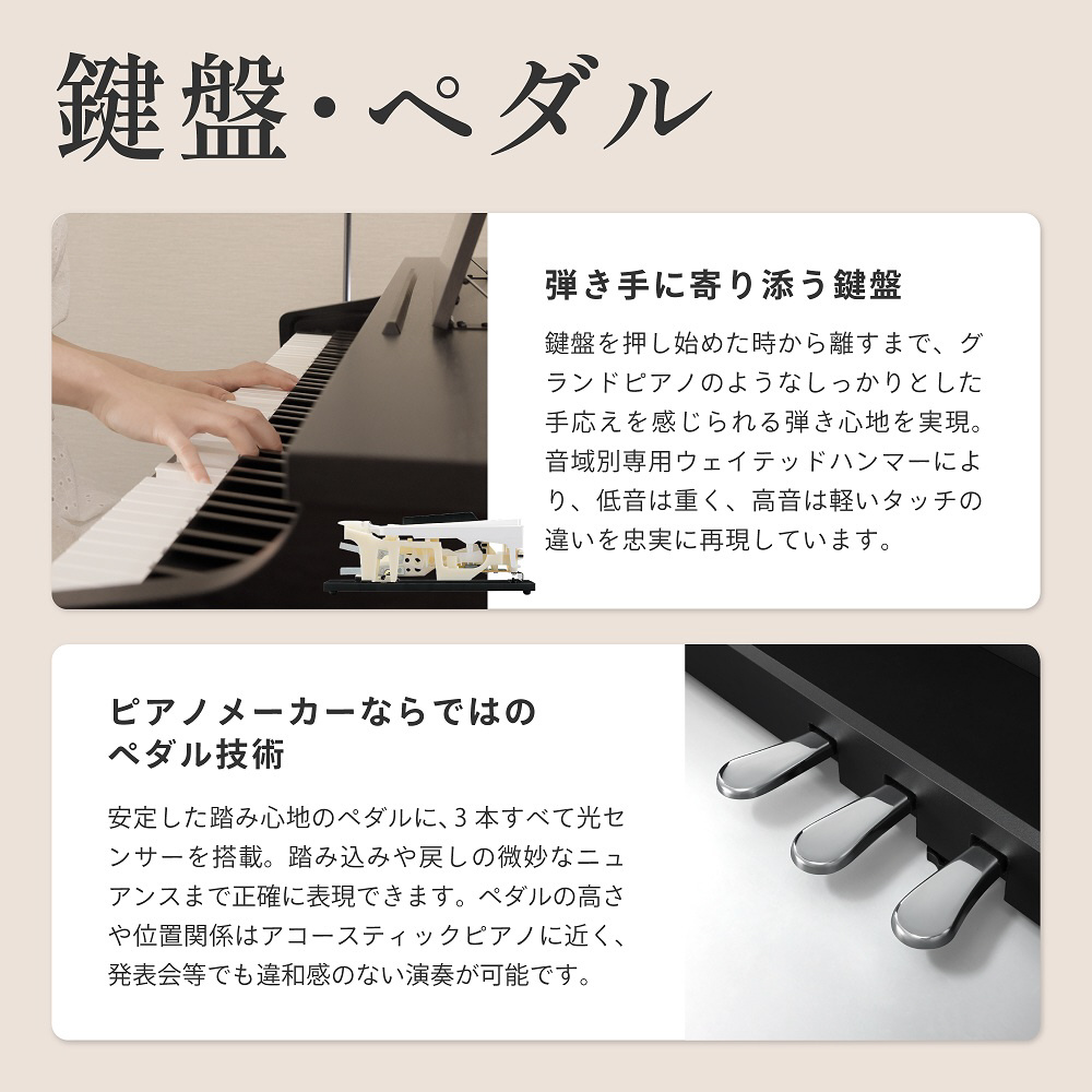 3本すべてがグランドピアノと同じ踏み心地で、本格的な演奏体験が味わえ、光センサー搭載でペダルの動きを正確に感知。細かな表現も思い通りにコントロールすることができます。
