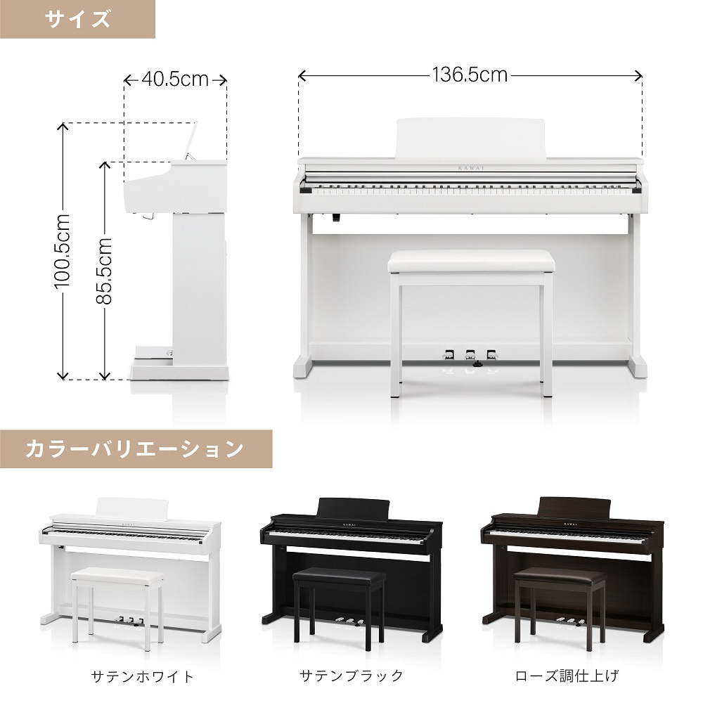 手が届く、なのに本格派。美しい音とタッチはもちろん、楽しみ方も使いやすさも、ぜんぶ詰め込みました。ピアノが初めての方にもやさしく、インテリアにもすっとなじむ一台です。