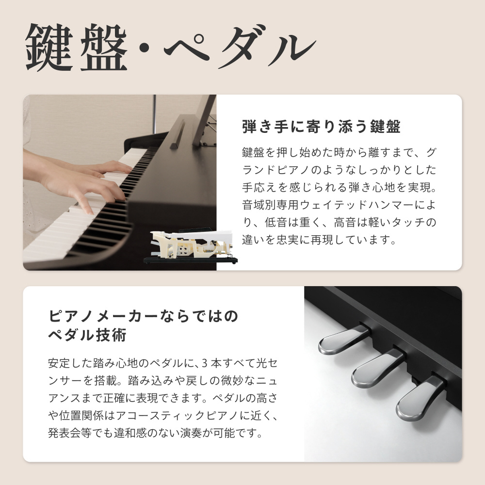 手が届く、なのに本格派。美しい音とタッチはもちろん、楽しみ方も使いやすさも、ぜんぶ詰め込みました。ピアノが初めての方にもやさしく、インテリアにもすっとなじむ一台です。