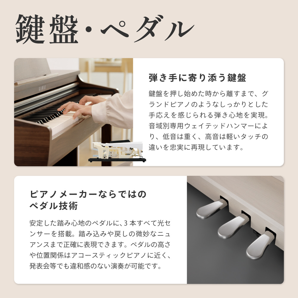 手が届く、なのに本格派。美しい音とタッチはもちろん、楽しみ方も使いやすさも、ぜんぶ詰め込みました。ピアノが初めての方にもやさしく、インテリアにもすっとなじむ一台です。