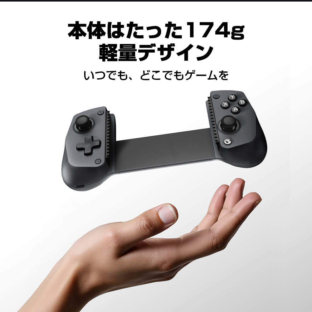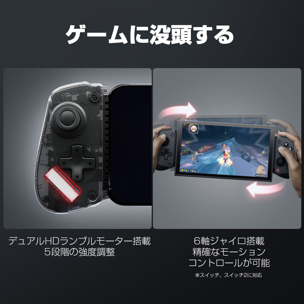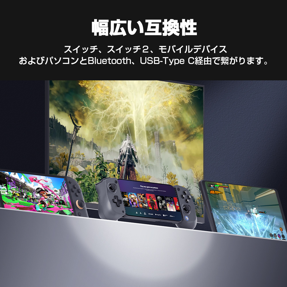 任天堂Switch、Switch2、Androidスマートフォン、iPhoneに対応した、無線Bluetooth及び有線接続用モバイルゲーミングコントローラーです。最長213mmまでのスマートフォンが装着可能。