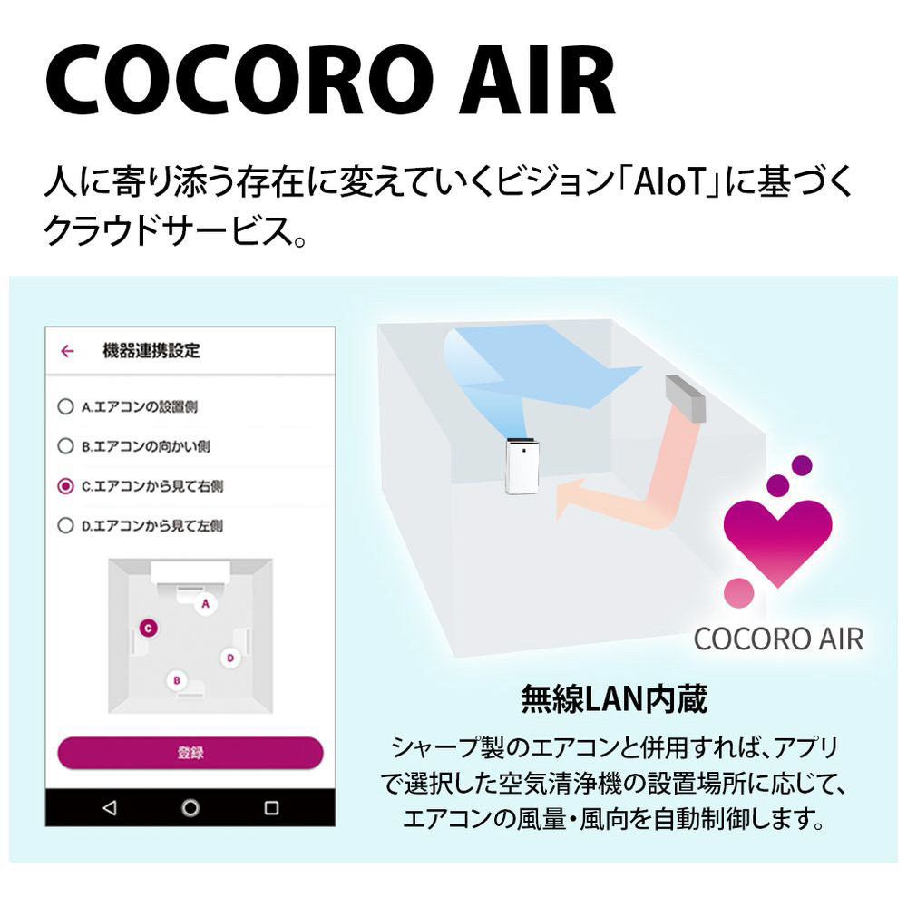 ・無線LAN機能搭載により、シャープ独自のAIoTクラウドサービス「COCORO AIR」に接続すれば、AI(人工知能)が室内やお住まいの地域(屋外)の空気の状態、お客様ごとの使い方や好みまで分析し、自動で快適な運転に切り換えたり、親しみのある音声で使い方をアドバイスしてくれます。