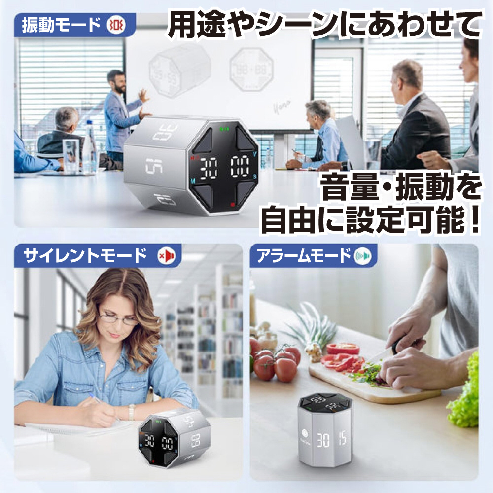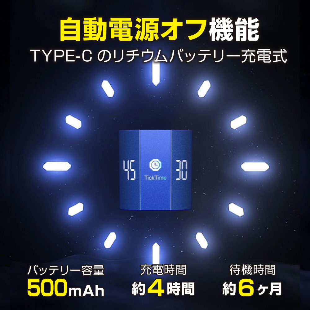 Ticktime Maxは、簡単なフリップで7種類のプリセットカウントダウン時間(3/5/10/15/30/45/60分)を提供。