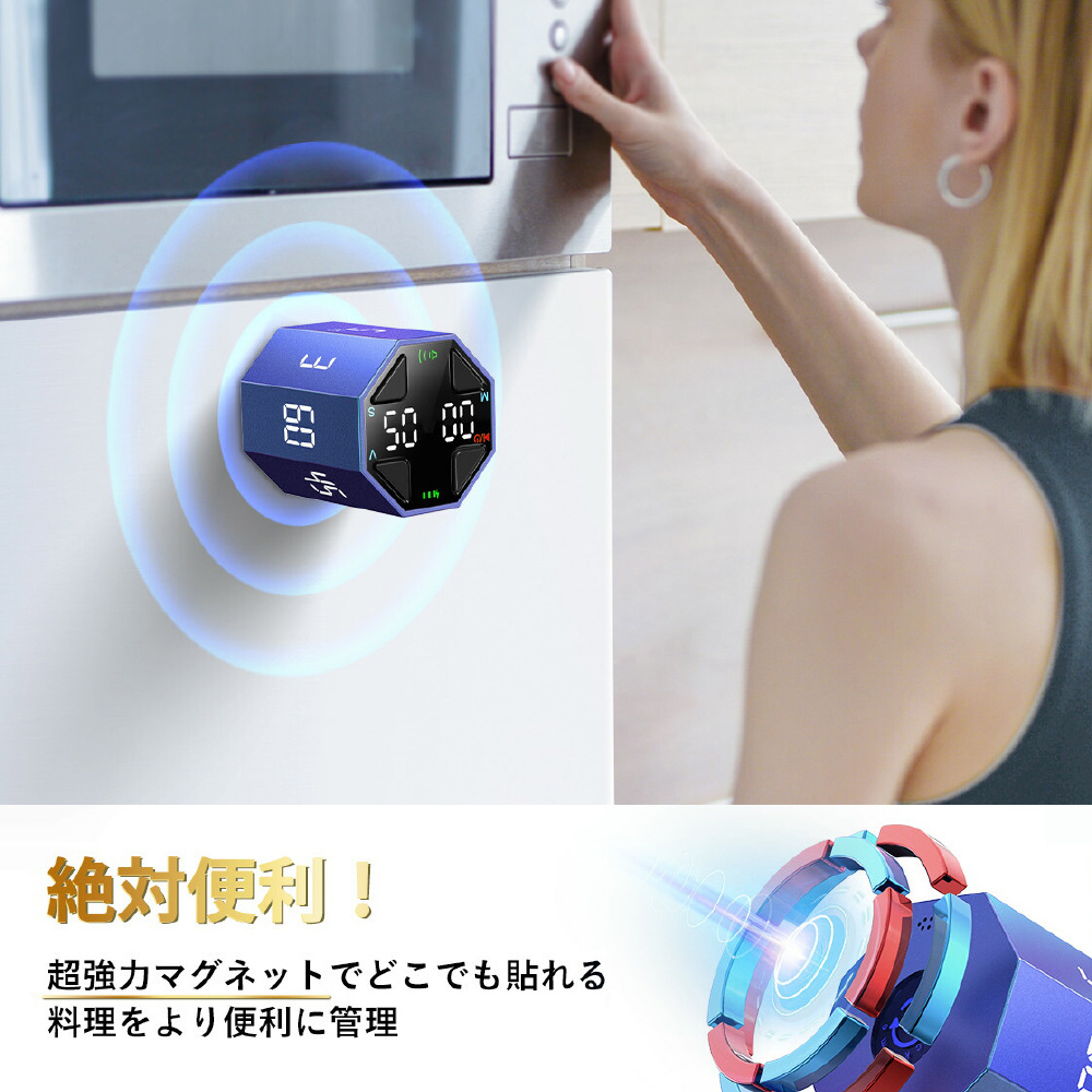 マグネットベースで冷蔵庫や鉄製の表面に取り付け、時間を気にせず手を使えます。