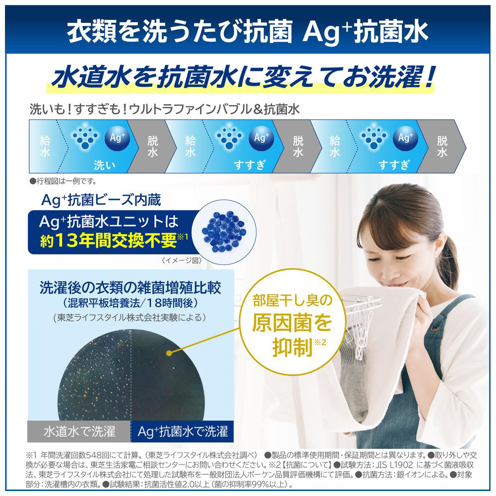 ウルトラファインバブル水がAg+抗菌ユニットを通過すると、銀イオンの抗菌成分が溶けてAg+抗菌水を生成。抗菌成分が、ウルトラファインバブルとともに繊維の隙間に入り込み、お洗濯のたびに抗菌して、衣類に雑菌が繁殖するのを防ぎます