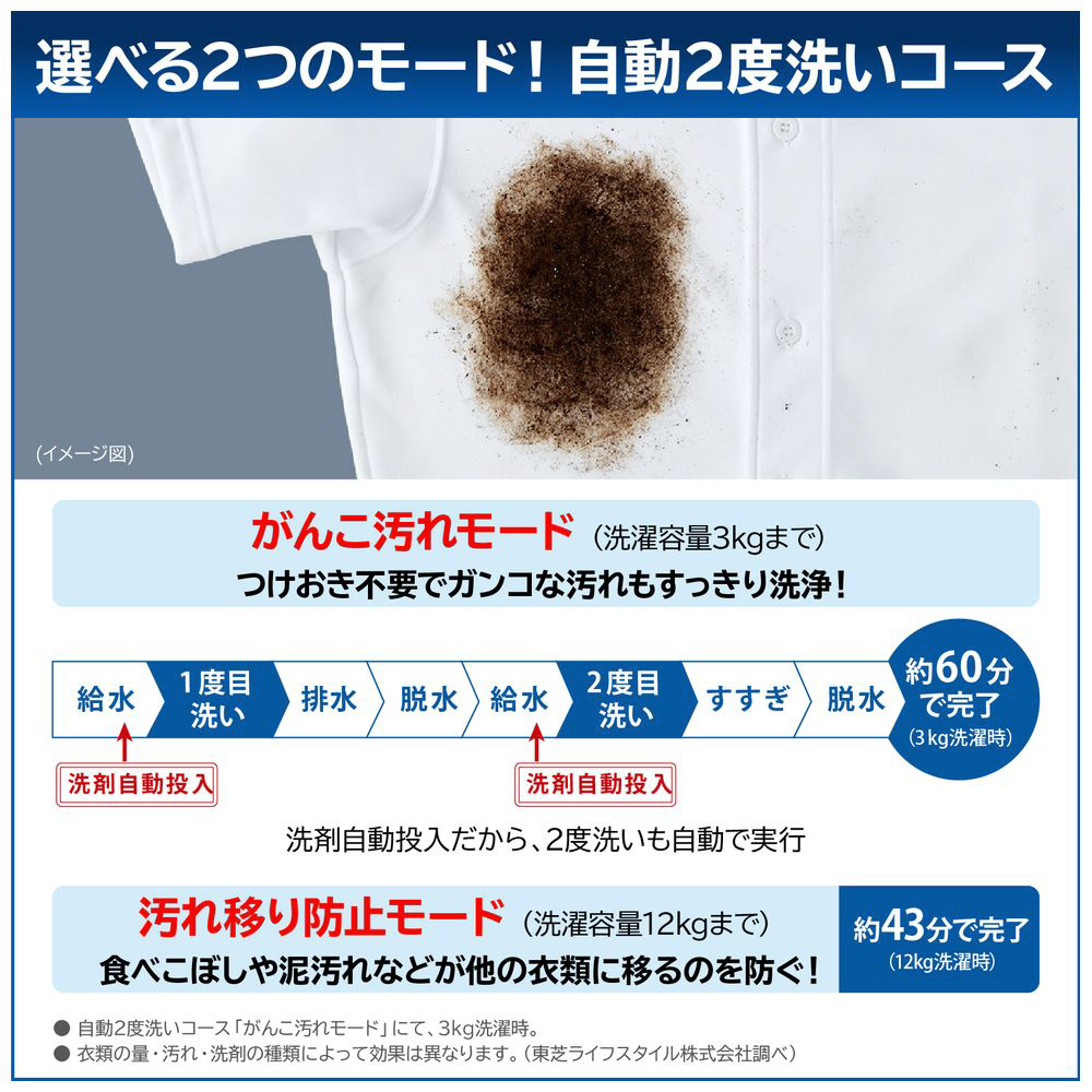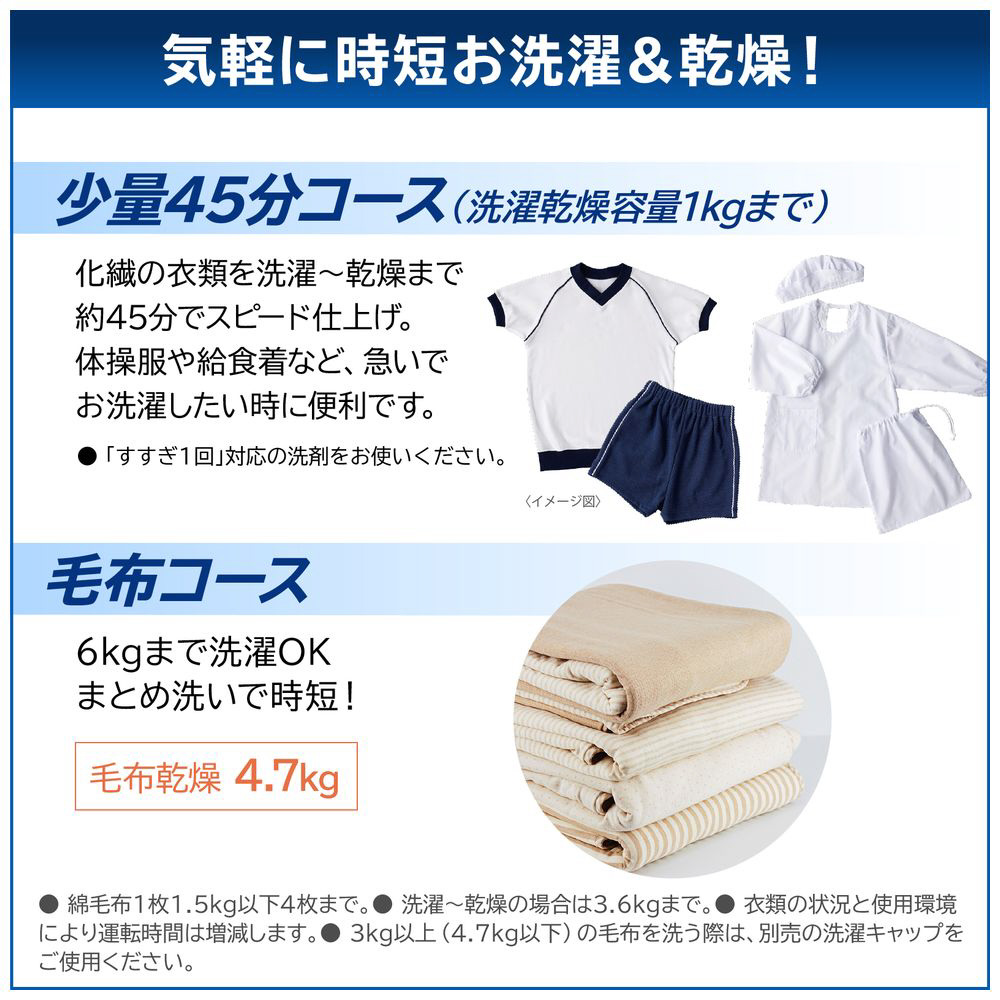 5kgの衣類を約15分でお洗濯。軽い汚れの衣類や洗い分けしたい衣類をスピードお洗濯。6kgの衣類なら約20分でお洗濯。