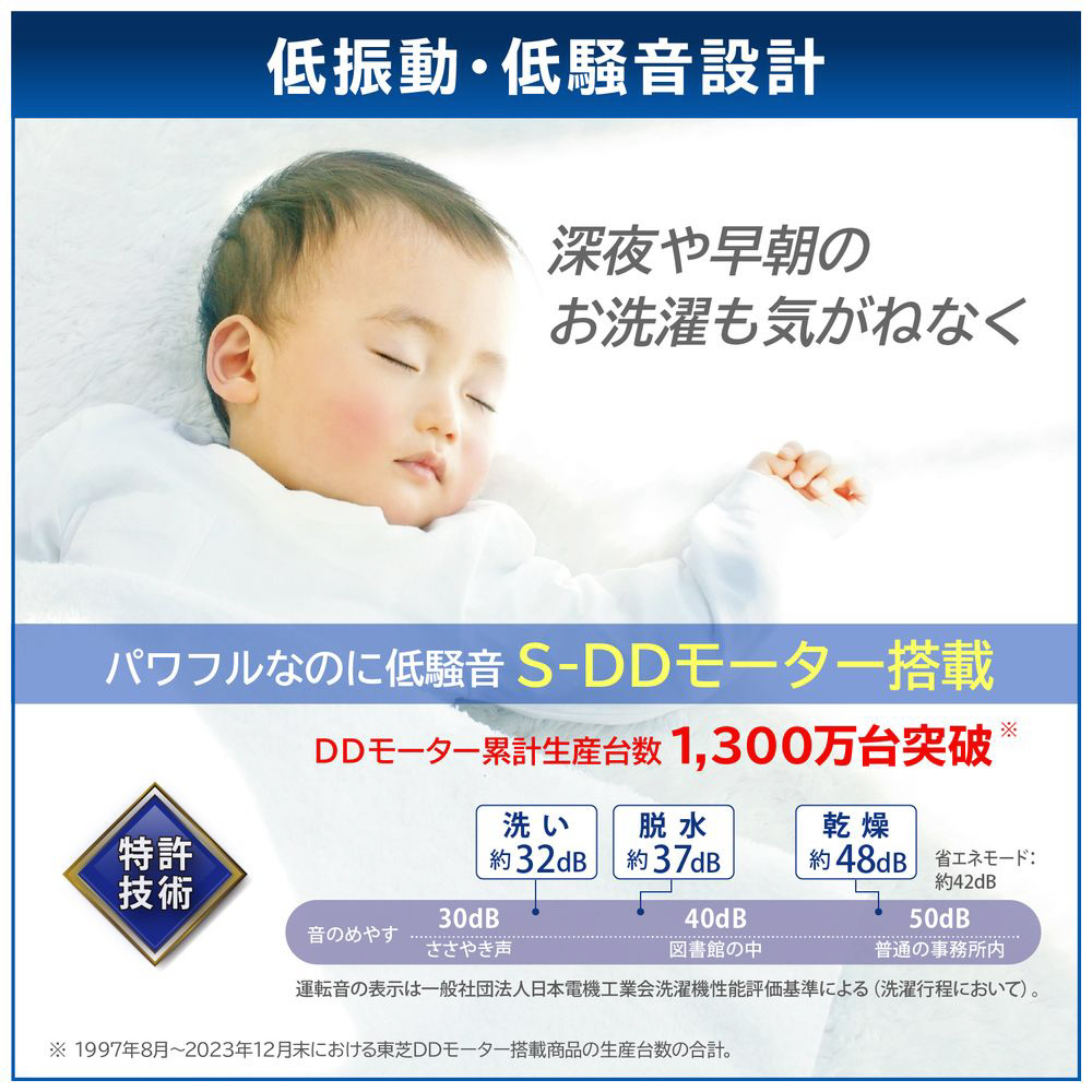 騒音の原因となるギアやベルトがないから運転時のギア音やモーターのうなり音を抑えます。深夜や早朝のお洗濯も気兼ねなくできます。