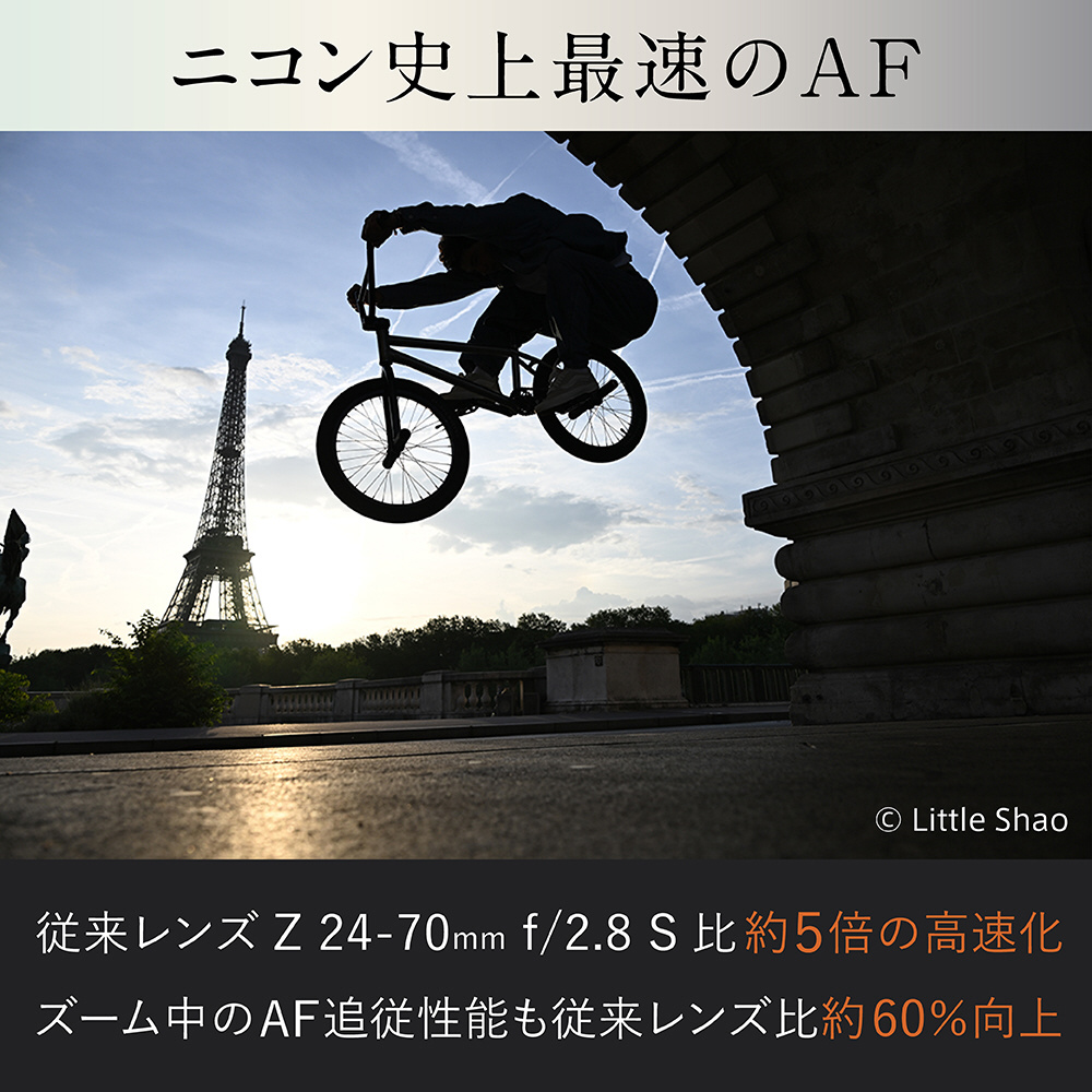 ニコン独自のシルキースウィフトVCM(SSVCM)をAF駆動用アクチュエーターとして採用したマルチフォーカス方式で、ニコン史上最速※1のAF速度を実現。従来のNIKKOR Z 24-70mm f/2.8 Sと比べ、約5倍の高速化※2を達成しています。また、ズーム操作中のフォーカス追従性能は、従来レンズに比べて約60%向上しており、動画撮影中も被写体にしっかりとピントを合わせ続けることができます。