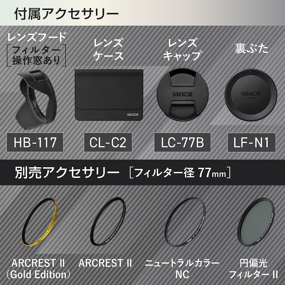 | 付属品 | レンズキャップ77mm LC-77B(スプリング式)、裏ぶた LF-N1、レンズフード HB-117、レンズケース CL-C2 |