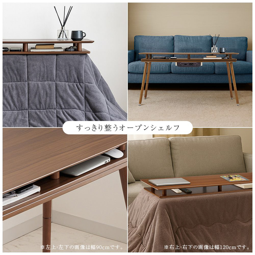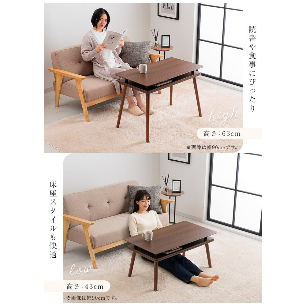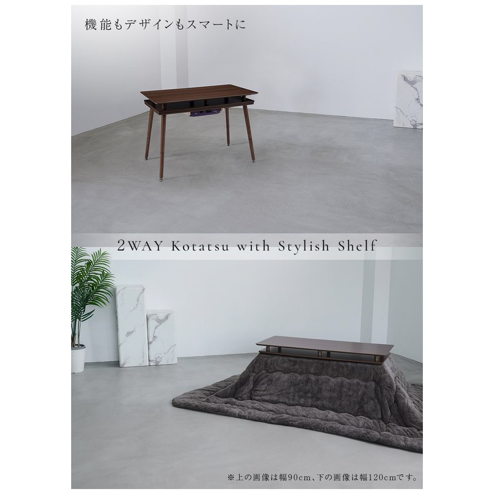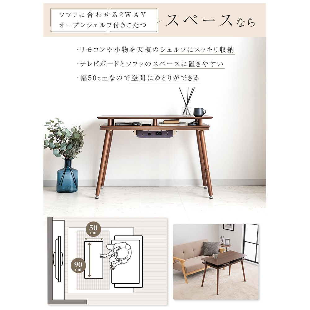 シェルフ付き 2Wayこたつテーブル 長方形 90×50cm オープンシェルフ ハイタイプ ロータイプ
