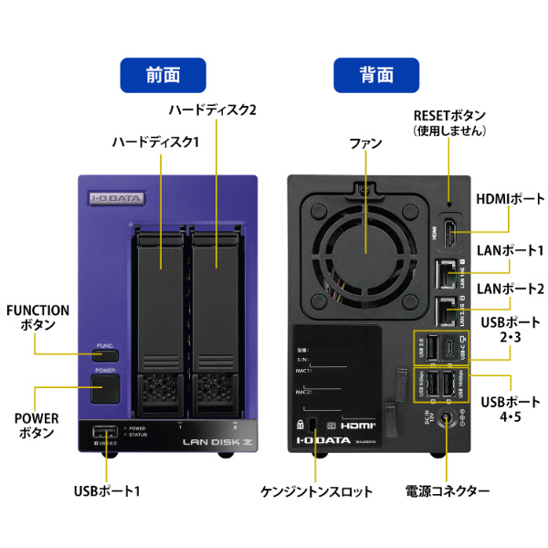 2台のハードディスクを搭載し、RAID 1(ミラーリング:出荷時設定)およびRAID 0(ストライピング)を構成可能です。