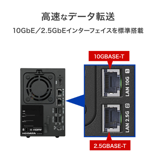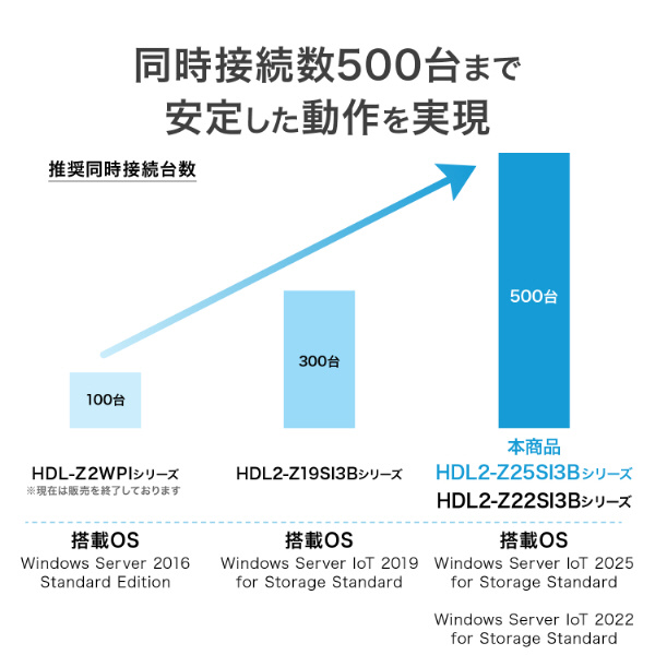 本商品は、CPUに第12世代インテル Core i3プロセッサーを搭載した法人向けのNASです。最大500台の同時接続が可能となり、セキュリティチェックやバックアップなどの負荷がかかる処理を行っていても、快適な動作を実現します。