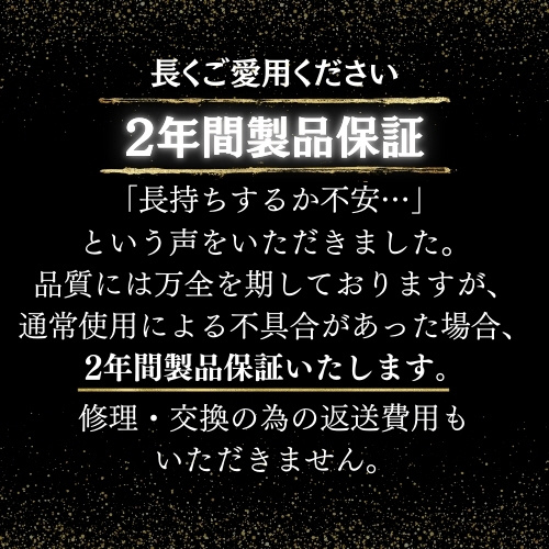 長くご愛用いただくために、通常使用での破損、不具合があったらすぐに修理・交換いたします。返送費用もいただきません。