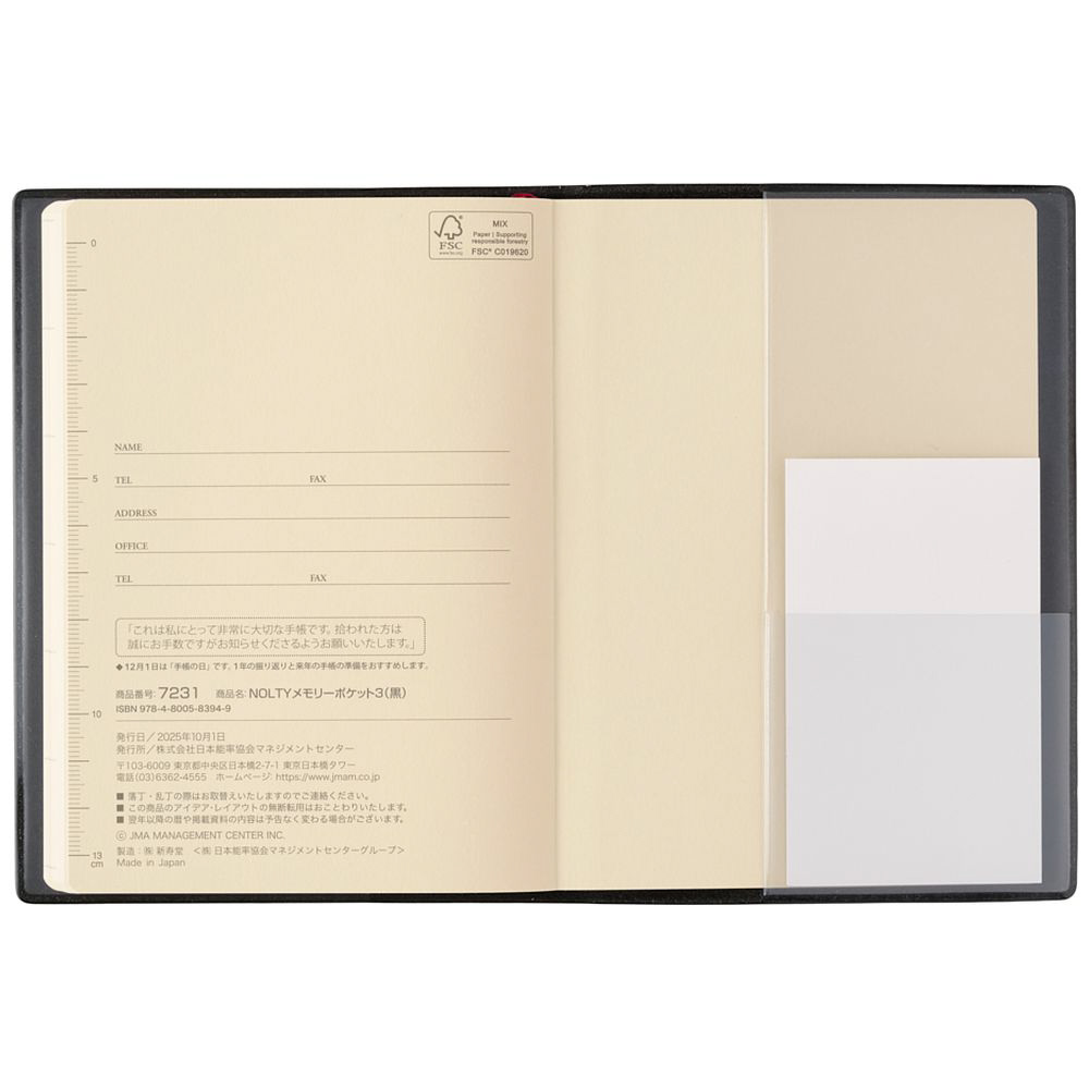2026年版1月始まり NOLTY(ノルティ) メモリーポケット3 手帳 黒 7231 [マンスリー /A6 /月曜日始まり]