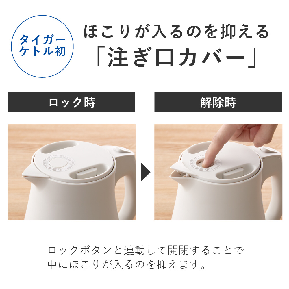 ロックしておけば、万一倒れても注ぎ口からのお湯もれをおさえます。