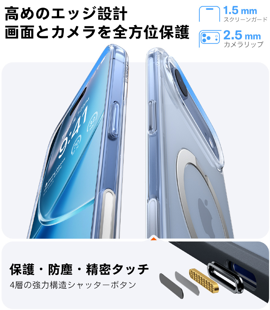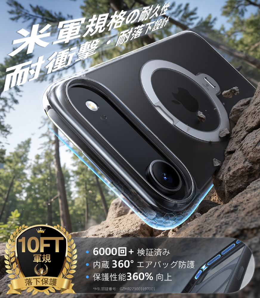 ・2.44m落下防止性能:フレーム部分の強化保護デザインで2倍のMIL耐衝撃性能