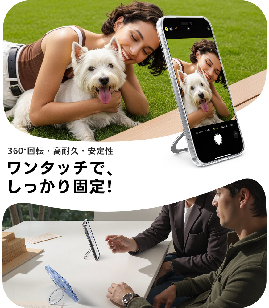 ・無限回転スタンド:4象限ピボットブラケットにより、スマホを15°?85°の水平角度、0°?85°の垂直角度で支えられる(30000回以上の開閉テスト済み)
