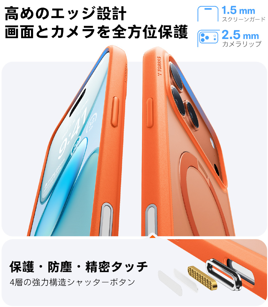 ・TORRAS独自のHalbach磁石技術:内蔵された38個のN52磁石により18Nの吸着力を実現し、すべてのMagSafe対応アクセサリーに対応可能