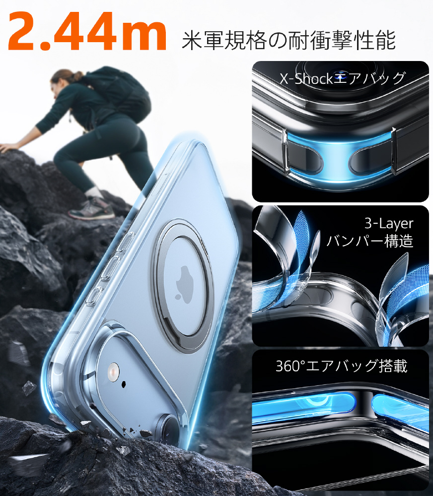 ・全体にエアクッションが配置。米軍規格の「MIL STD-810G」をクリアしており、2.44mからの落下耐久性能。