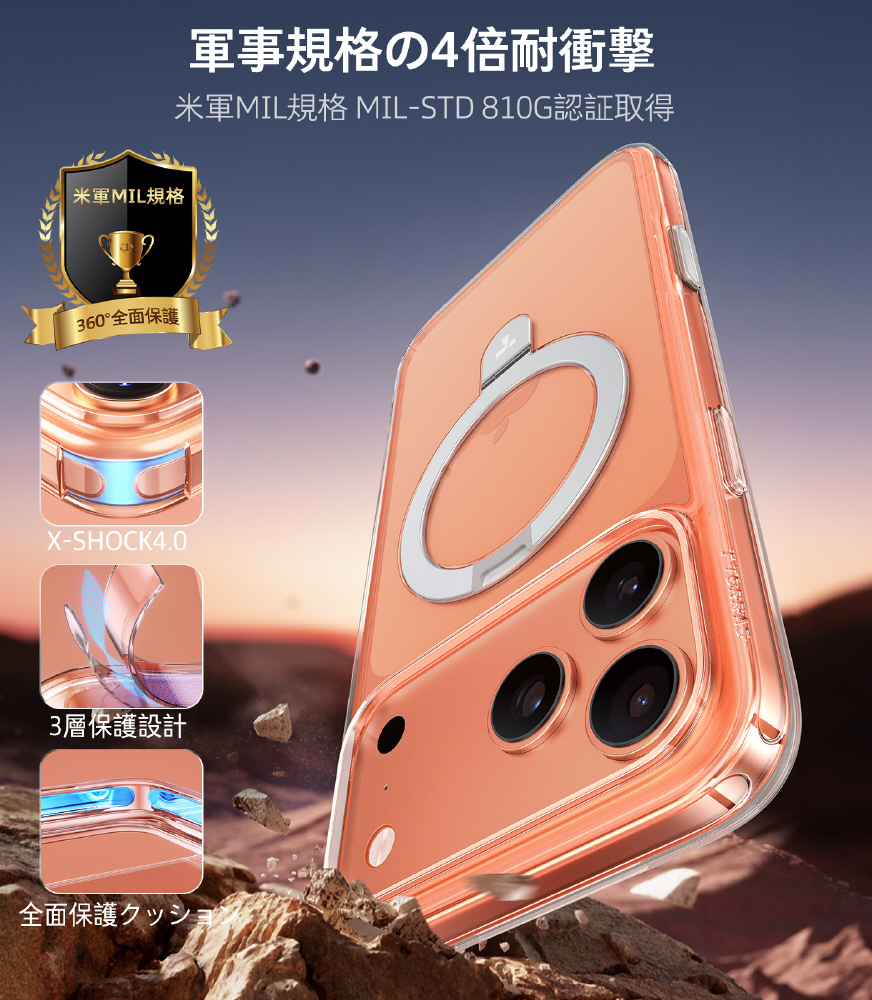 ・2.44m落下防止性能:フレーム部分の強化保護デザインで2倍のMIL耐衝撃性能