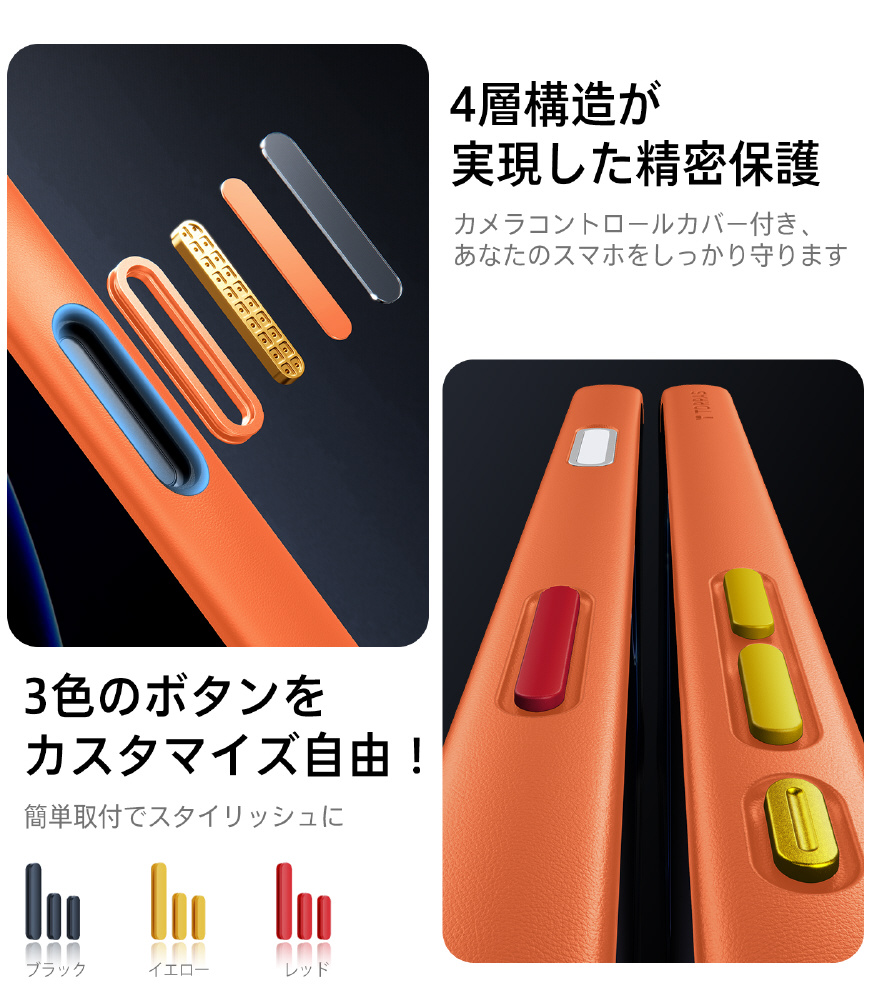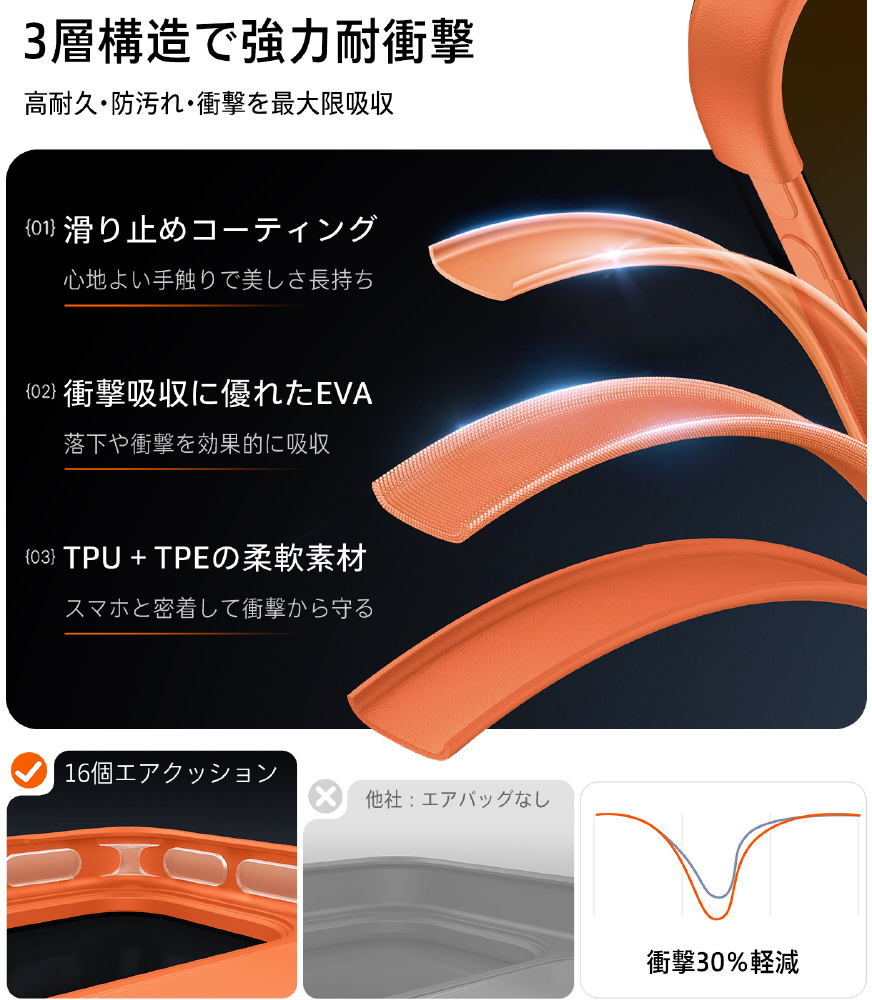 ・360°衝撃を吸収できるエアクッションのデザインのため、衝撃を受けやすい4隅から全方向にスマホとカメラをしっかり保護できます。