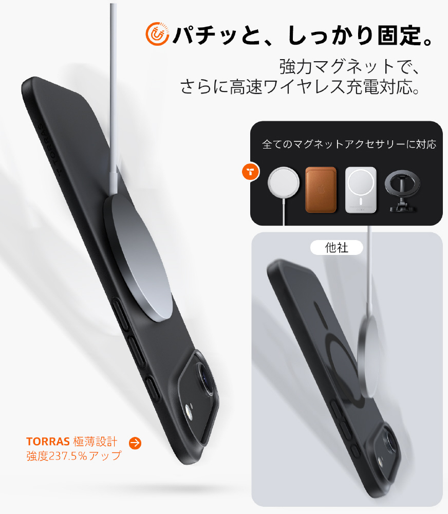・TORRAS独自のHalbachマグネットテクノロジー、内蔵の38N52マグネットにより、MagSafeアクセサリと互換性があります。