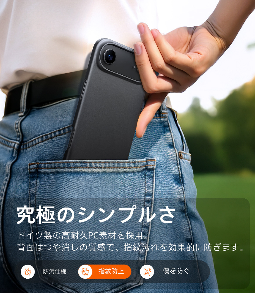 ・厳選されたPC素材を使用、背面はつや消しの質感で、非常に滑らかな感触です。指紋痕を効果的に防ぎます。