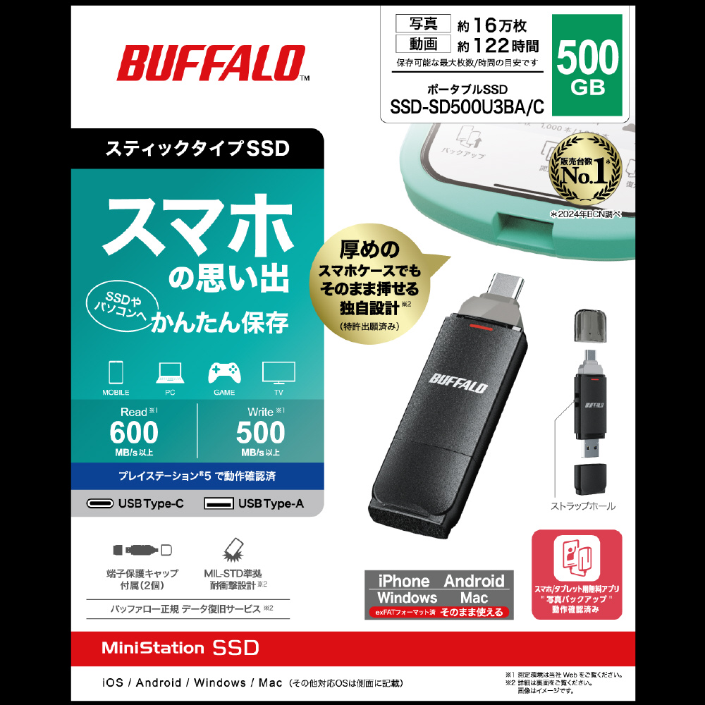 スマホの写真・動画をかんたん保存◎Type-CとA両対応のコンパクトなスティック型SSD