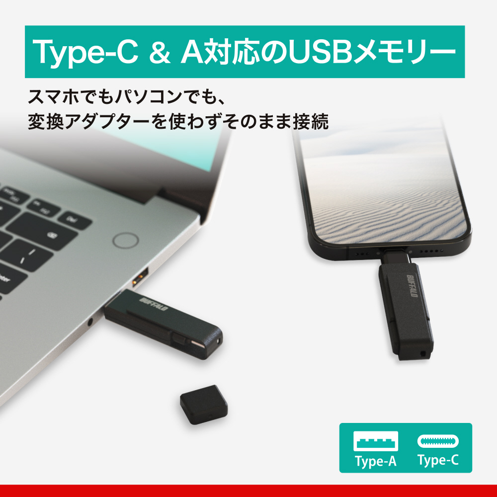 USB Type-C / Type-A両方の端子を備えているため、さまざまな機器に直接つなぐことができるUSBメモリーです。