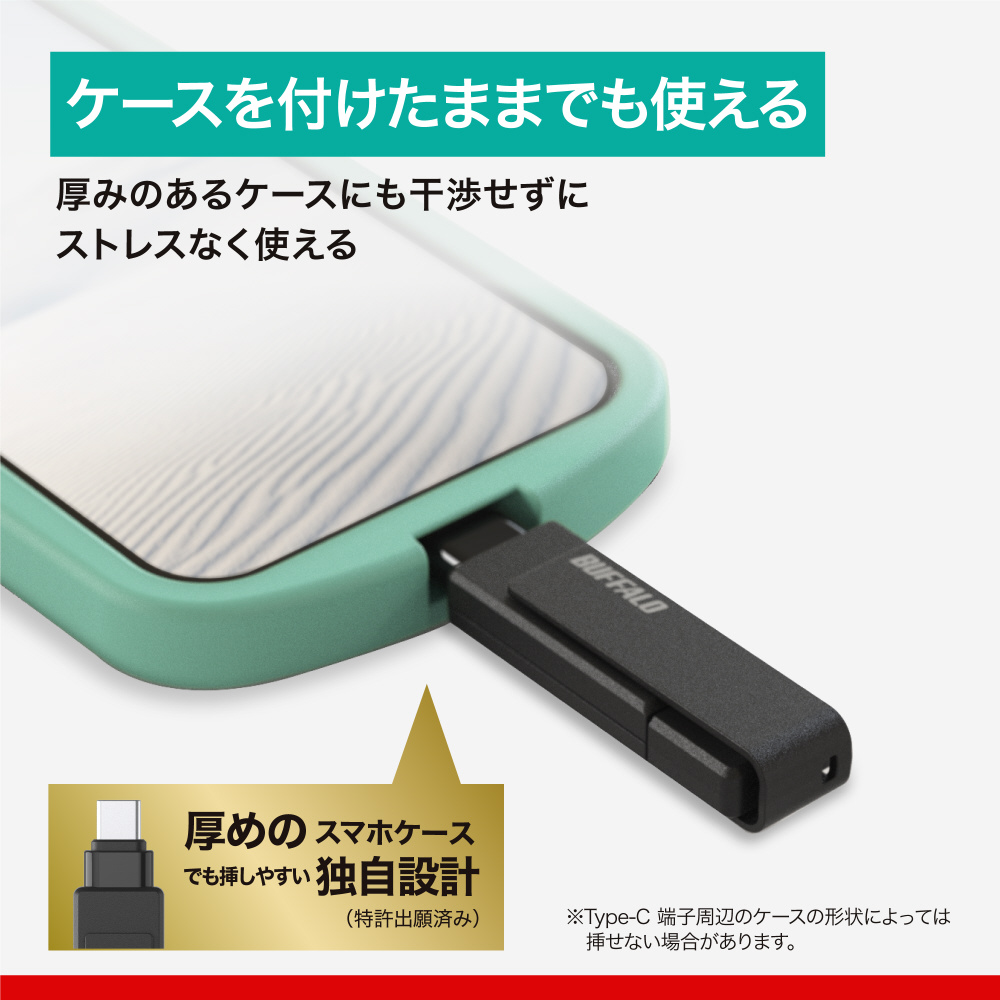 USB Type-C コネクター部分を細く加工することで、厚みのあるスマートフォンケースに対応。スマホケースをつけたままでも本商品をスマホにつなぐことができます。