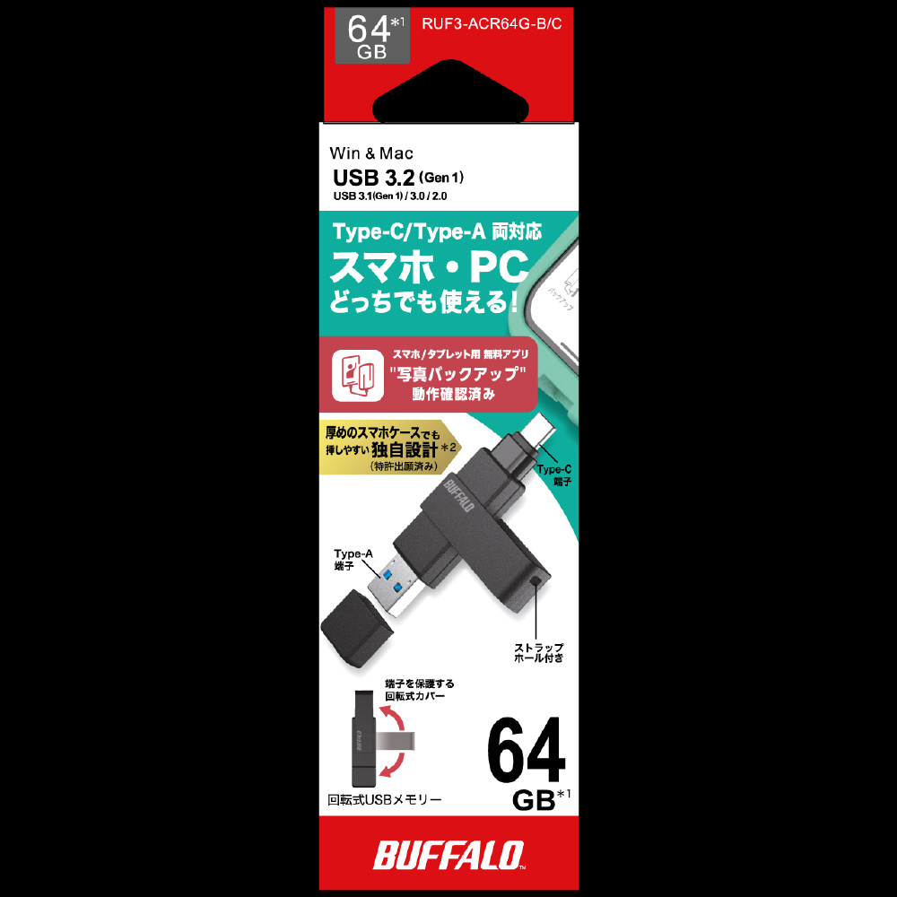 「USB 3.2(Gen1) Type-C/Type-A両対応 回転式USBメモリー」