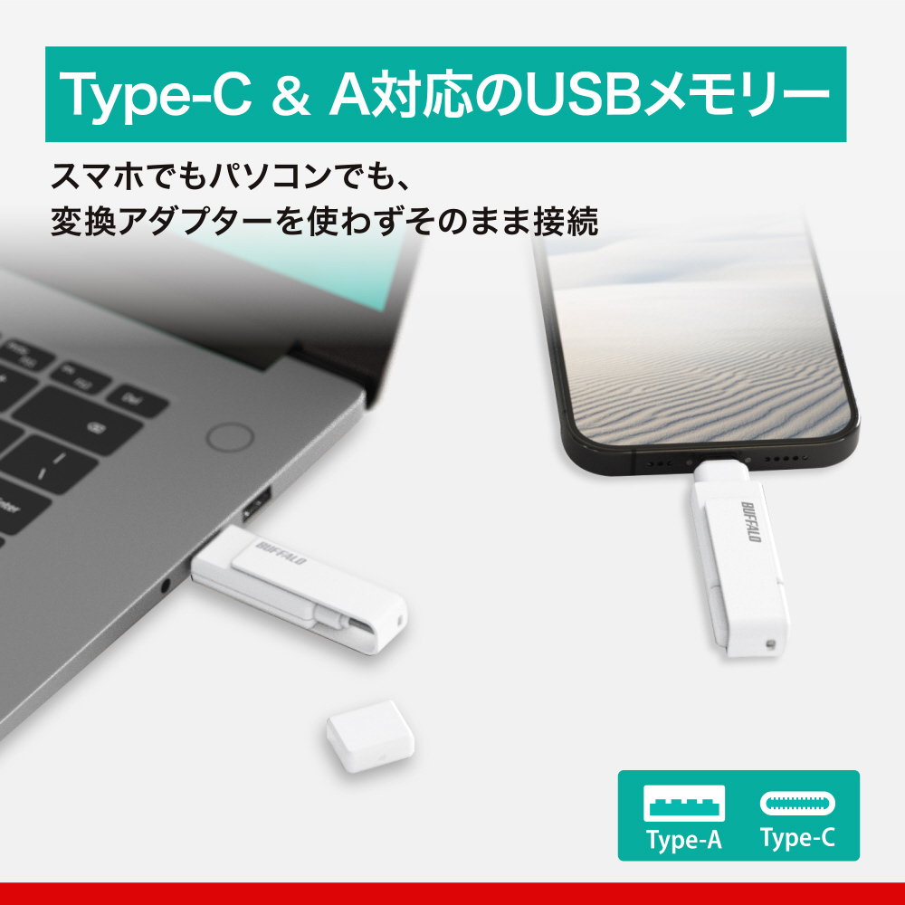 USB Type-C / Type-A両方の端子を備えているため、さまざまな機器に直接つなぐことができるUSBメモリーです。
