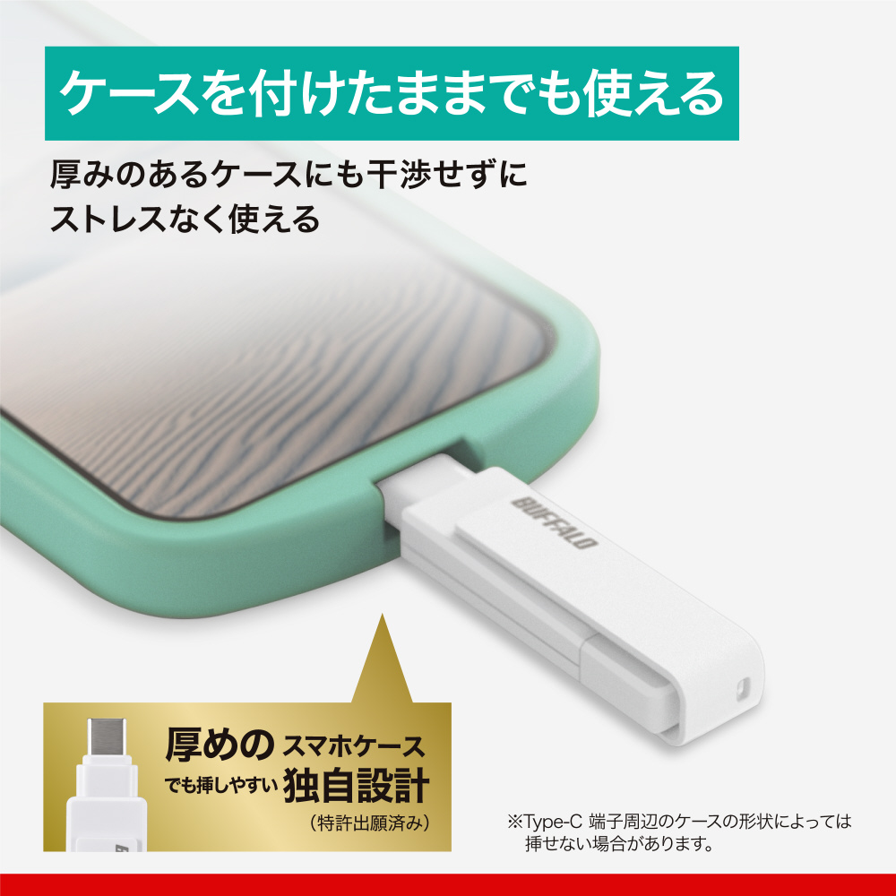 USB Type-C コネクター部分を細く加工することで、厚みのあるスマートフォンケースに対応。スマホケースをつけたままでも本商品をスマホにつなぐことができます。