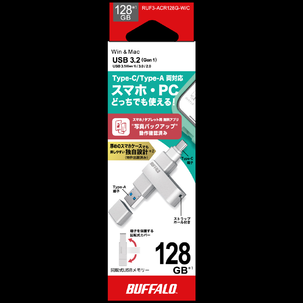 「USB 3.2(Gen1) Type-C/Type-A両対応 回転式USBメモリー」