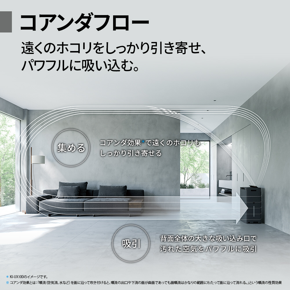 3方向気流制御ルーバーにより、広いリビングにもイオンを効率よく届けながら、コアンダ効果を応用した気流で遠くのホコリもしっかり引き寄せ、背面全体でパワフルに吸引します。